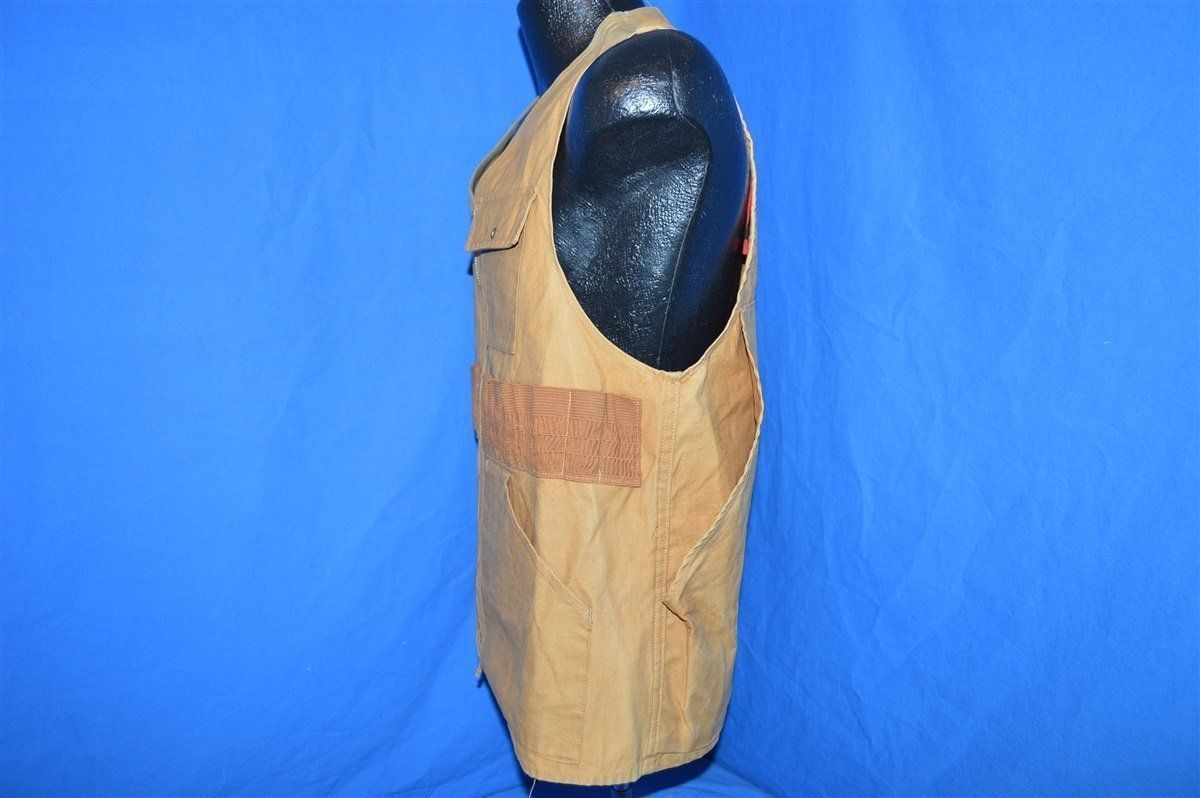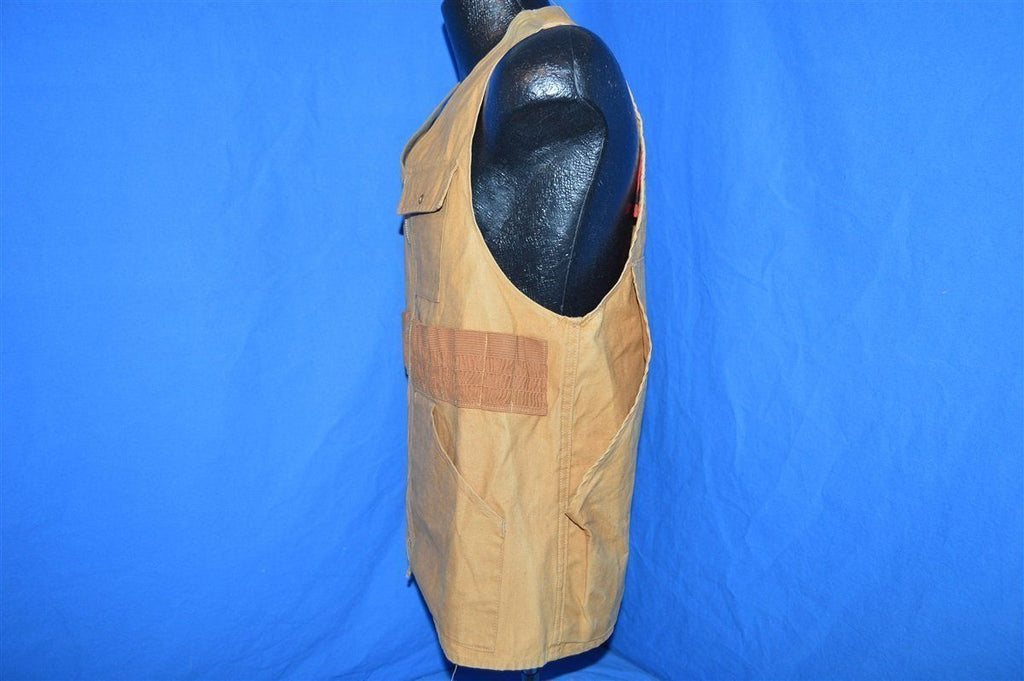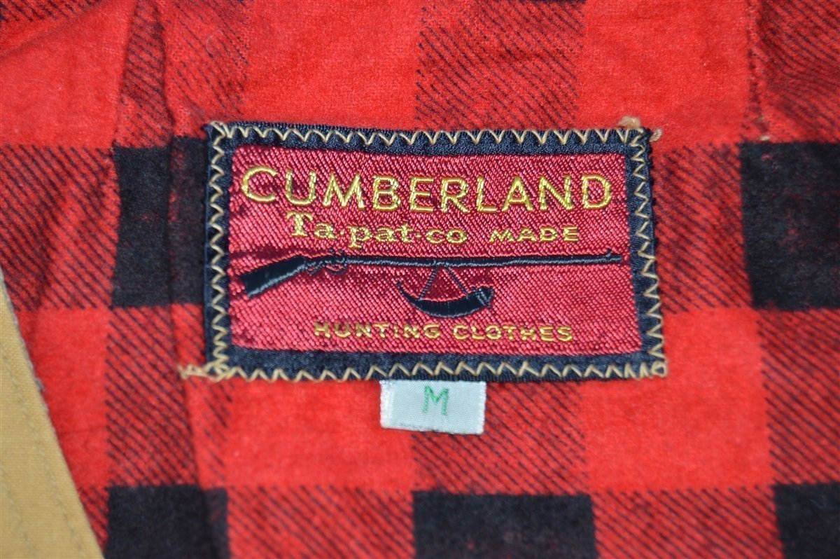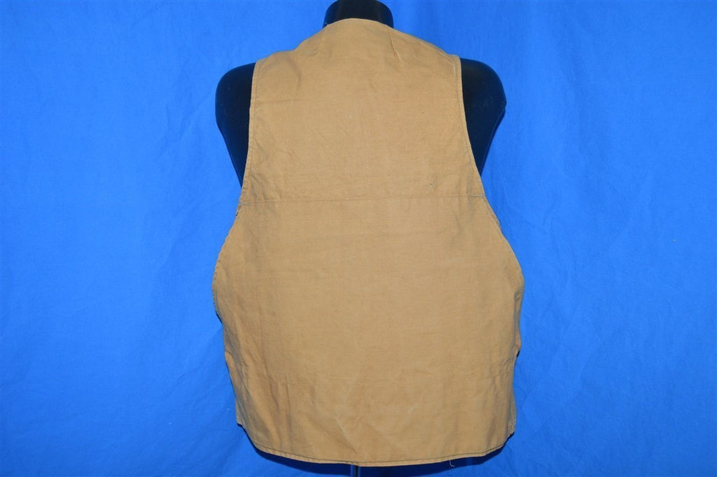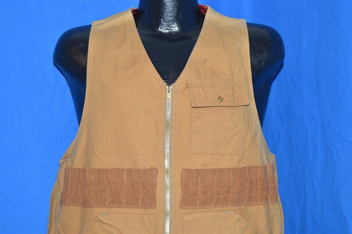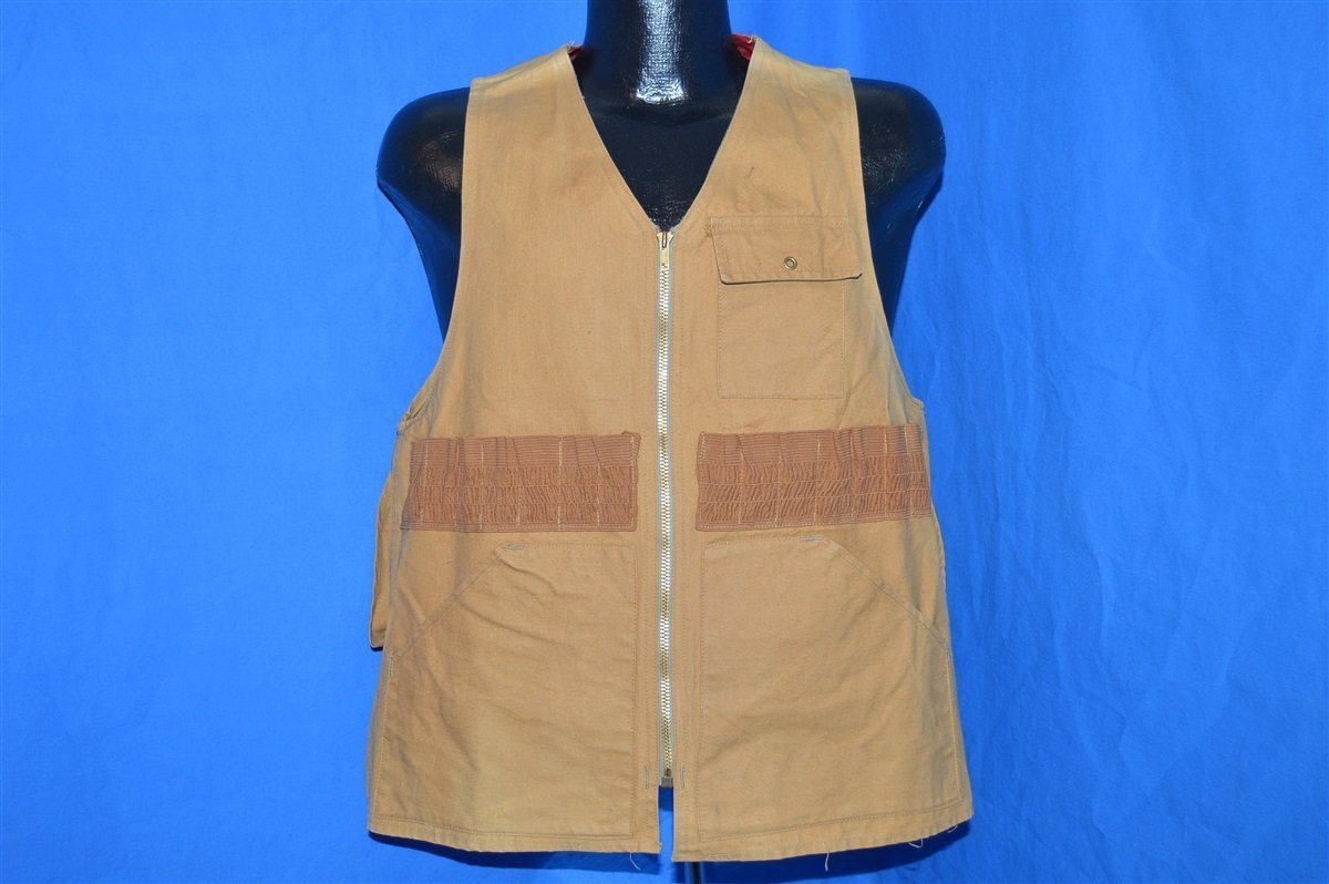This vintage hunting vest was made by Cumberland in the 1950s. The brown vest has a talon zipper closure and a single flapped pocket on the chest. It also features two front hand pockets and two sets of shotgun shell holders. There is a game pocket along the back.