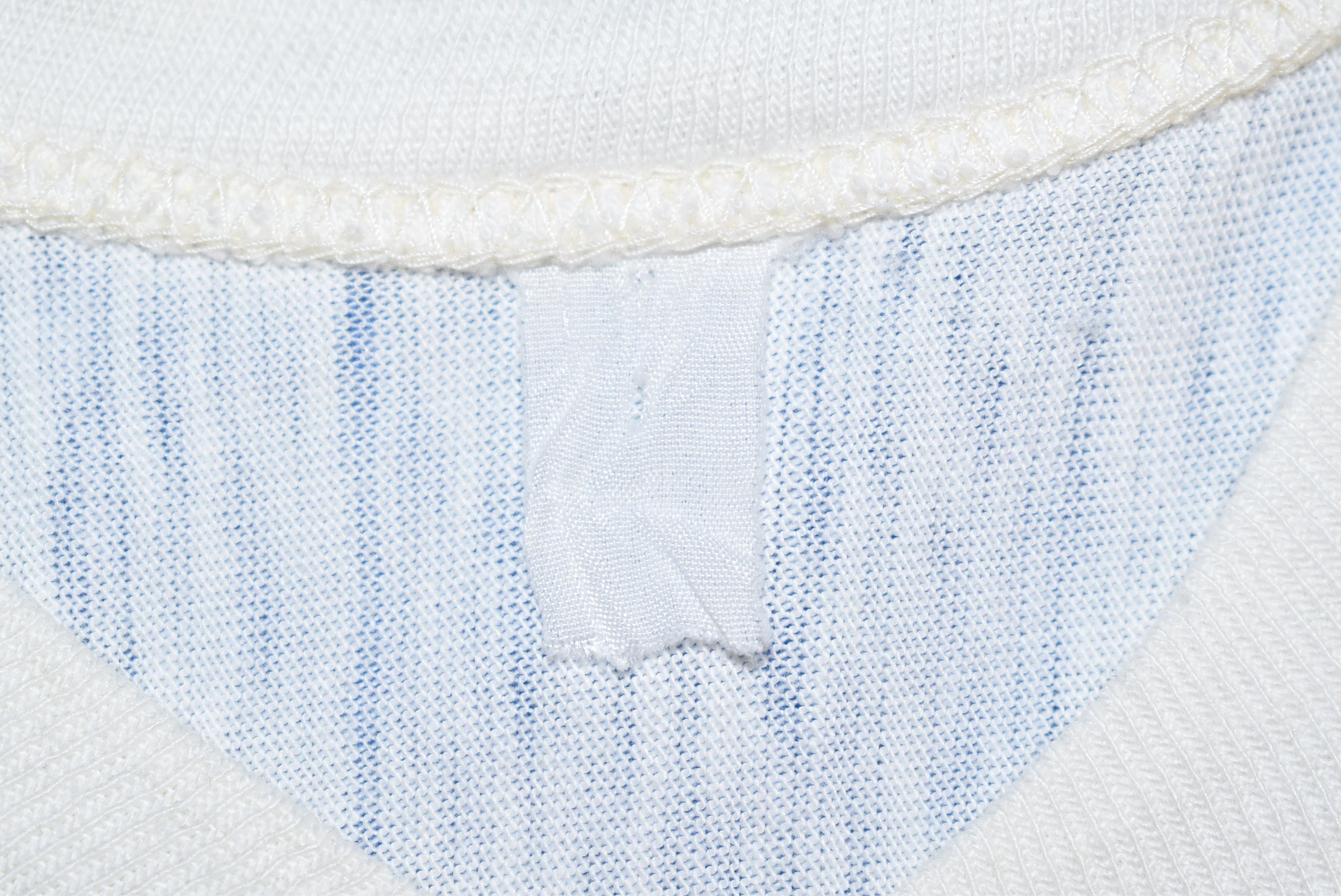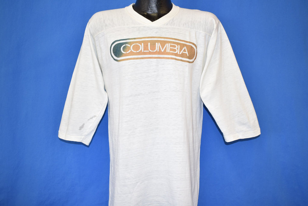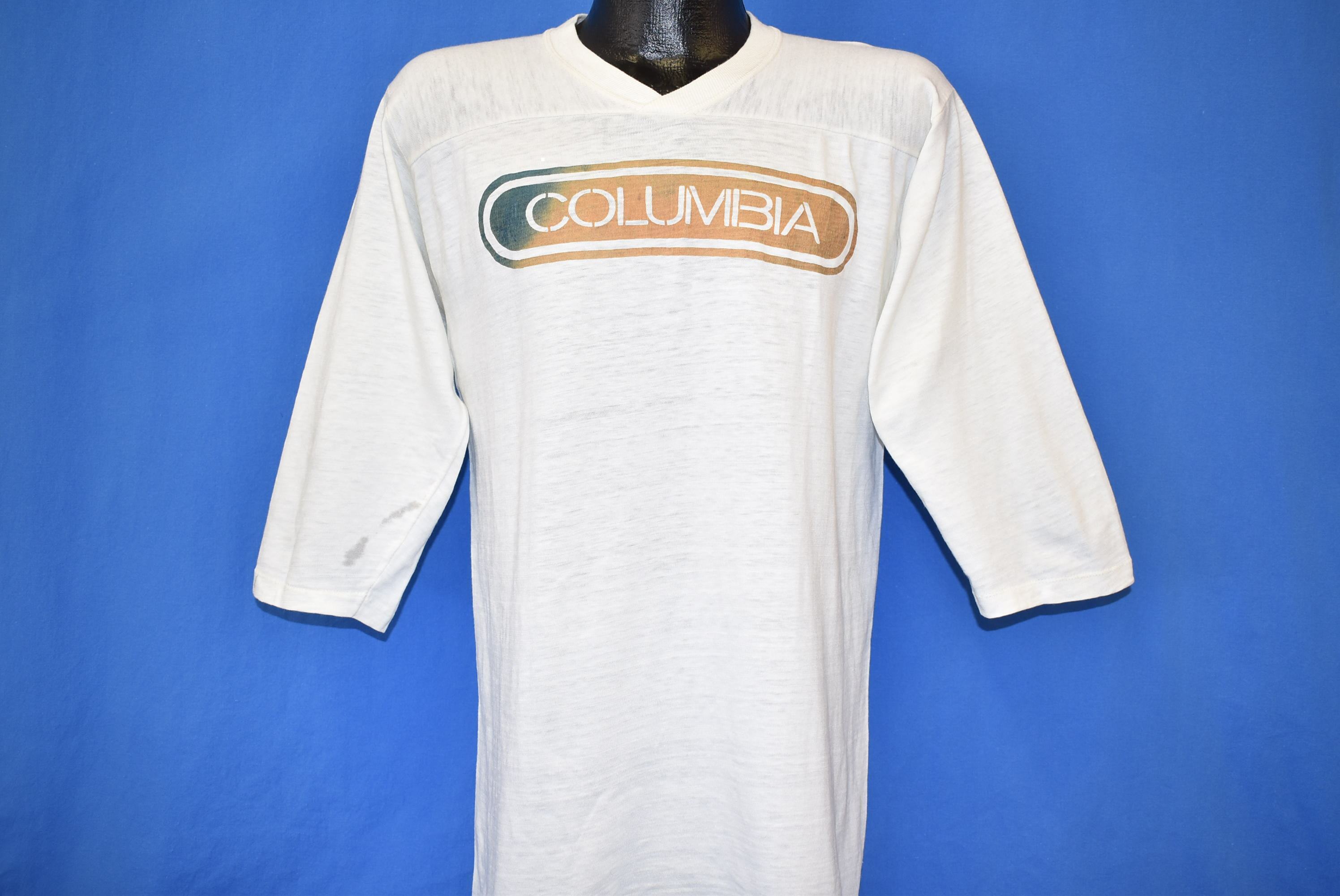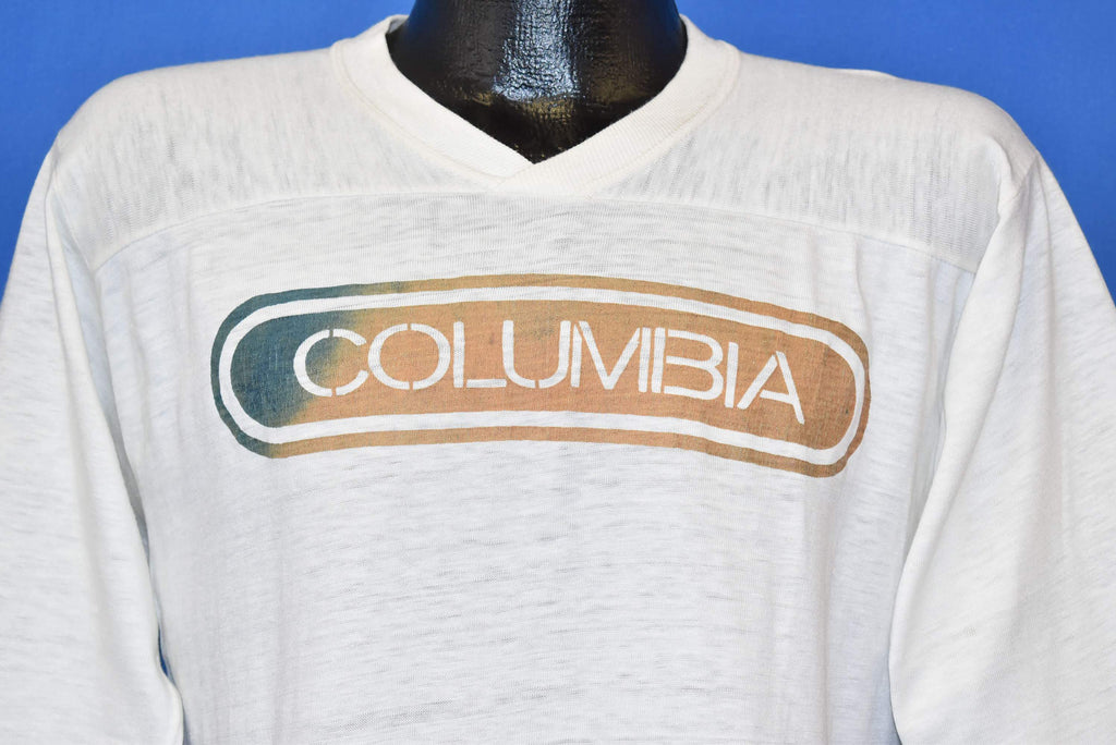 This worn in 70s jersey tee bears a faded logo for Columbia Records, the largest of Sony Music Entertainment's four flagship record labels. Columbia has signed many of the biggest names in music, including AC/DC, Johnny Cash, Neil Diamond, Earth, Wind & Fire, Duke Ellington, Janis Joplin, Pink Floyd, Santana, Simon and Garfunkel, Paul McCartney, and many more.