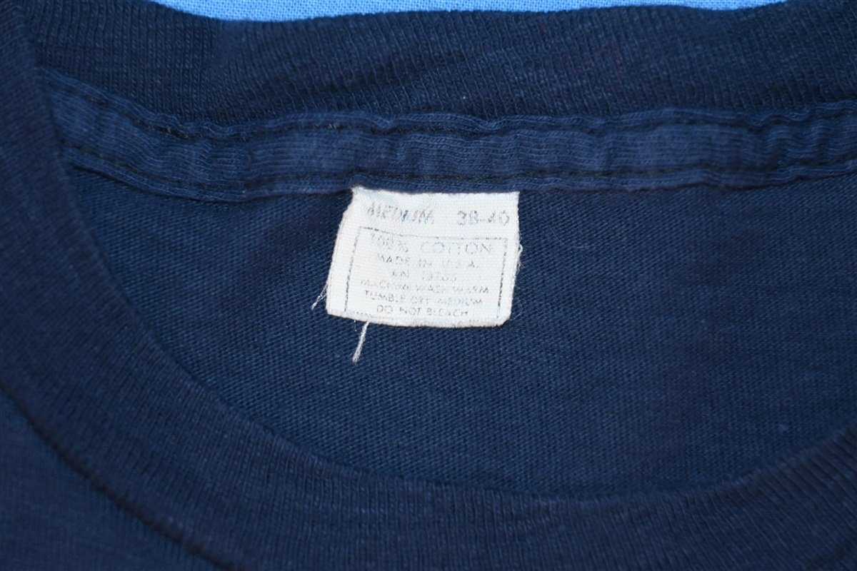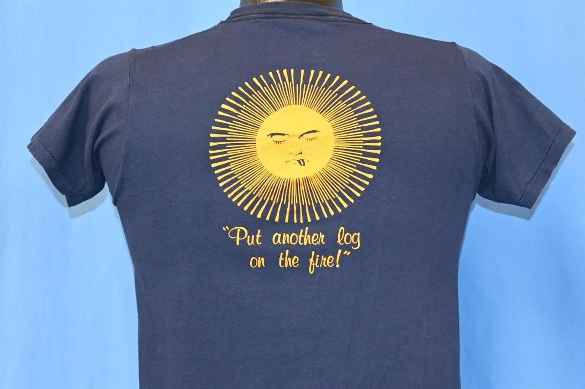 This unique 70s tee says, "I barely survived the 1st annual Bristol Stomp", and it looks like it was made for an event inspired by the regional dance trend the Bristol Stomp. The Bristol Stomp was a dance created by teenagers at the Good Will Hose Company in Bristol, Pennsylvania, and it was immortalized thanks to a 60s doo-wop song performed by the Dovells. The band would go on to also sing "Do the New Continental", which was featured in the John Waters movie Hairspray. The back of this tee has a graphic of the sun with the quote, "Put another log on the fire!" This is the name of another well-known song, in this case a country hit performed by Tompall Glaser.