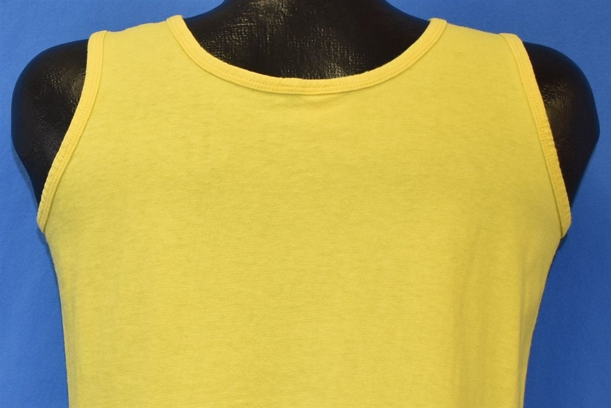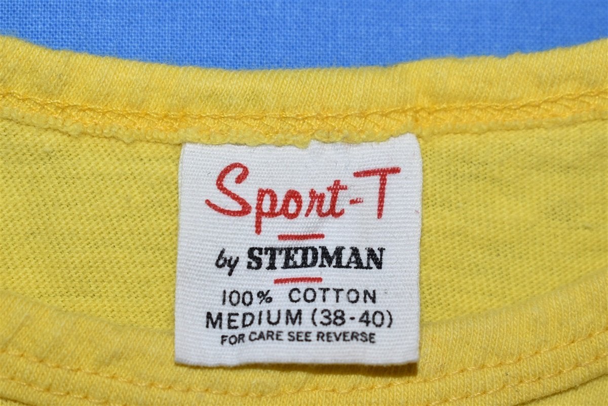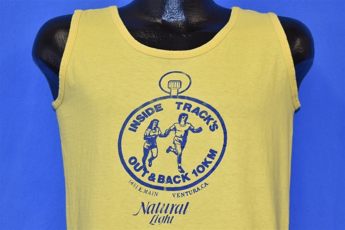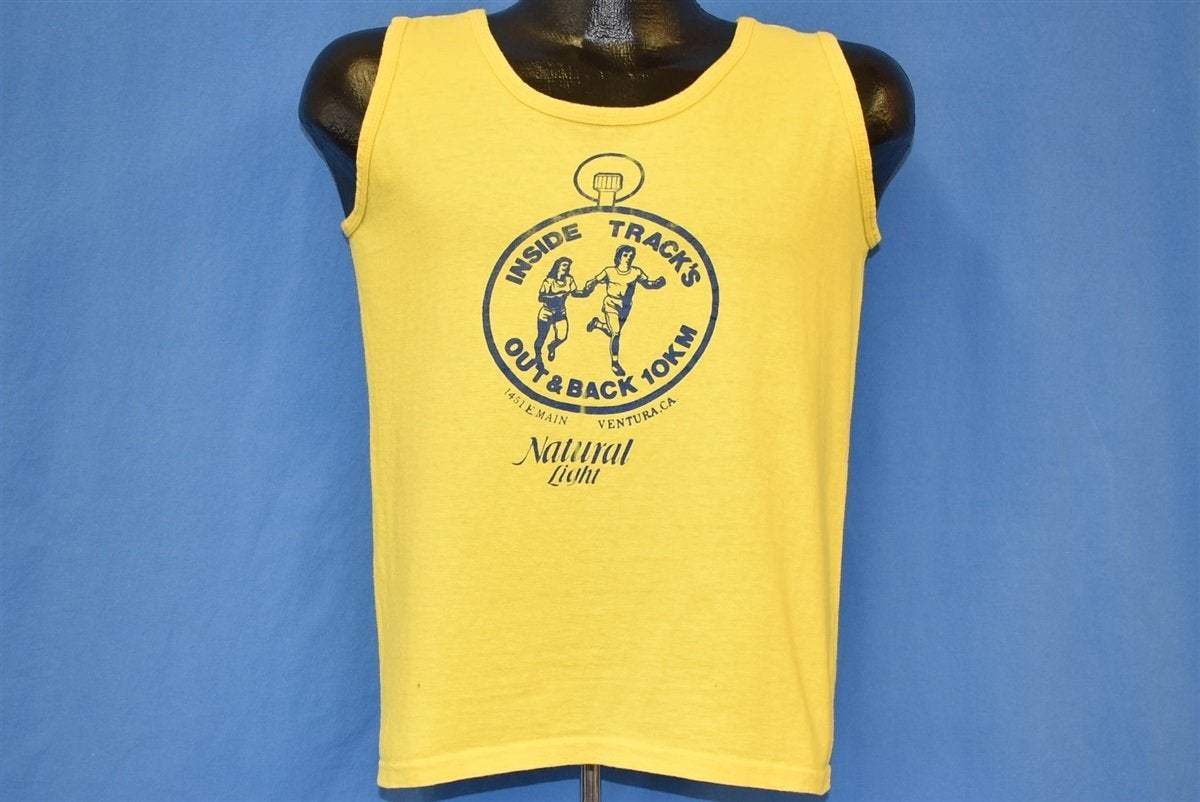 This bright yellow tank top is for a 10 kilometer running event that took place at the Inside Track in Ventura, California. The shirt includes a stop watch graphic and has the name of the event, Inside Track's Out & Back 10 KM, as well as the logo for the event sponsor, Natural Lite Beer. Inside Track was first opened in 1976 by Gary Tuttle, and it has remained a staple in the local running community ever since. Inside Track is a shop, which sells running shoes and apparel, but it also offers a running club for local athletes to meet and socialize.