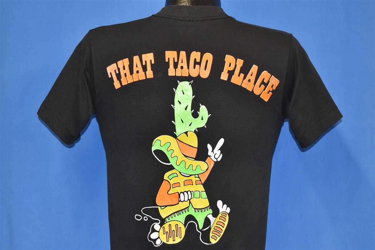 This classic promo tee was made for That Taco Place, a Mexican restaurant in Batavia, New York. It's held up great since the 1990s and has a ton of life left. Features double sided print, a strong cotton feel, and big colorful graphics. The cactus logo pictured here is the same one still in use as of 2022.