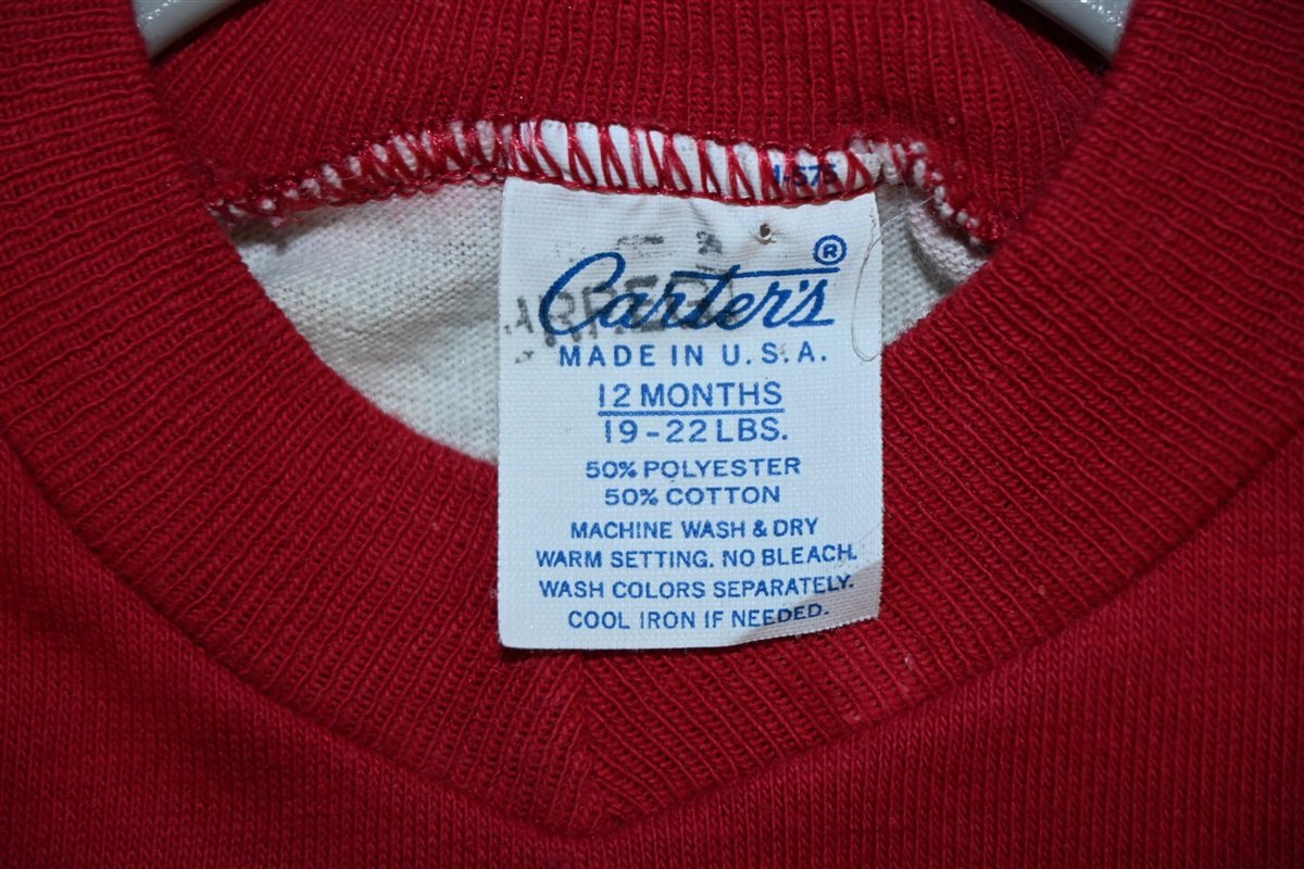Fits like a modern unisex baby 12-18 Months. The red of the collar has bled a little, see pics.