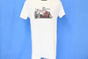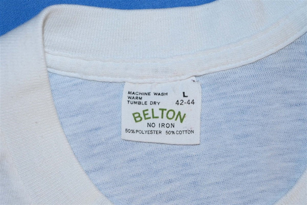 This cool vintage tee features a graphic of a chainsaw and the words "The Chain Saw King." This tee seems to be promoting the Homelite Textron Super 2 model chain saw. Homelite started producing gasoline powered chainsaws in the 40s. They revolutionized the tool by creating the first chainsaw that was made to be used by one person. Homelite was acquired by Textron in the 50s and the brand started producing wider arrays of power tools, like lawn mowers and leaf blowers. The Homelite Super 2 model was a gas powered chainsaw in production from the mid 70s to the early 80s.