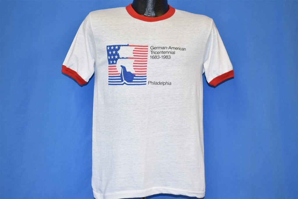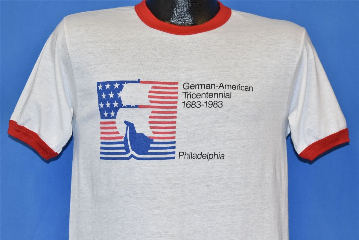 This vintage tee is dedicated to the German-American Tricentennial in Philadelphia circa 1983. It's aged really well and has a ton of life left. Features a classic ringer style, soft poly cotton, and old school graphics.