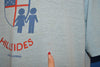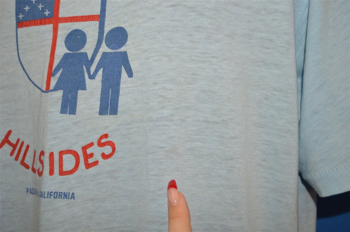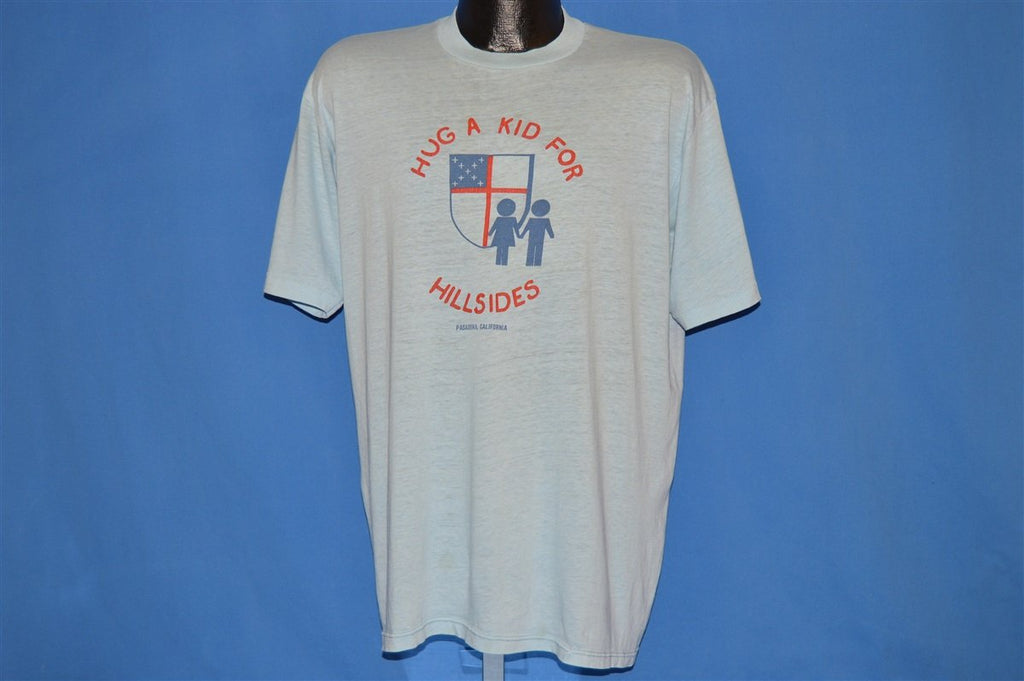 This shirt has a graphic on the front of two figures holding hands in front of the symbol for the Hillsides Episcopal church in Pasadena, California. It says "Hug a kid for Hillsides".