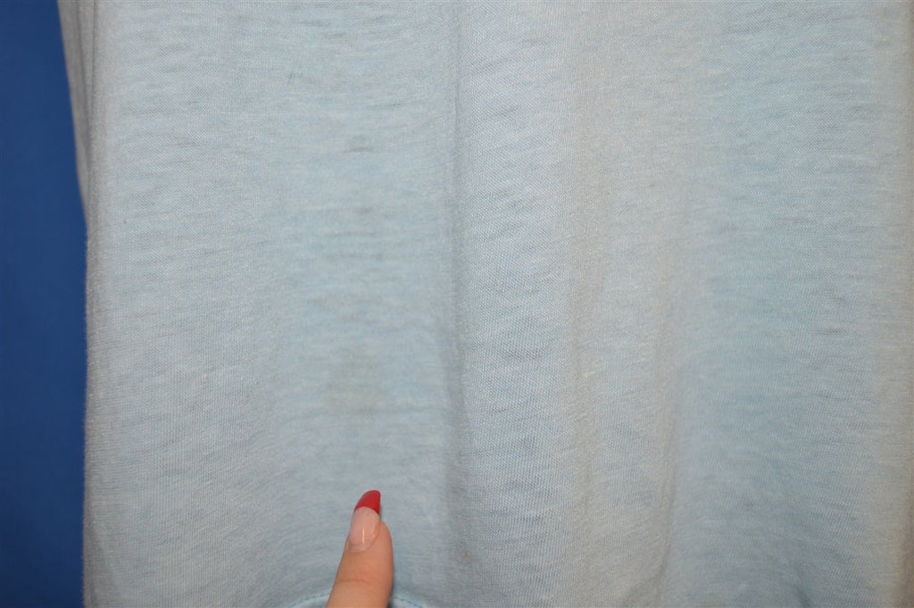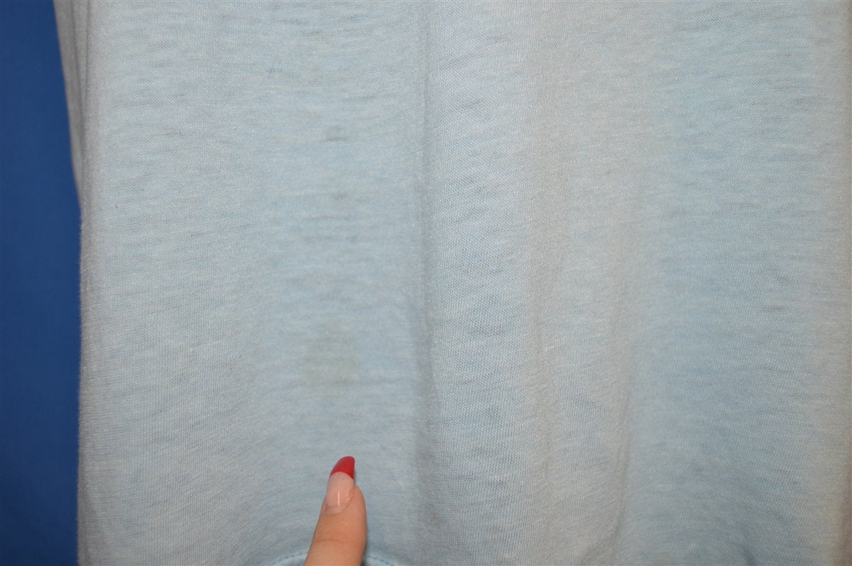 This shirt is distressed. It is super soft and thin, with discoloration and spots throughout. See pics.