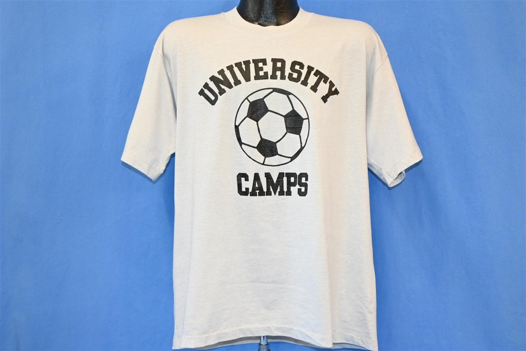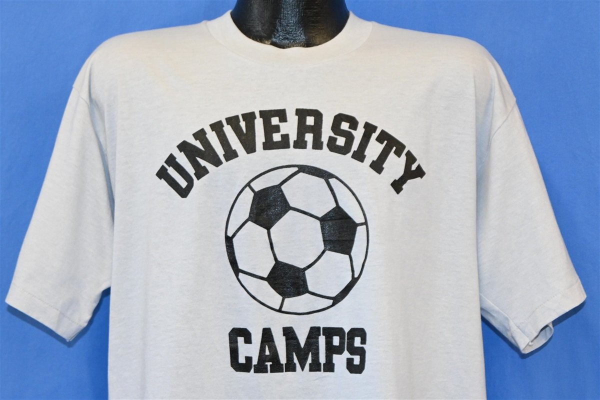 This sweet graphic tee is for something called "University Camps." It features a graphic of a soccer ball on the front and the logo for Puma brand sneakers on the back. This tee was most likely made for a university's summer soccer program that was sponsored in part by Puma. Many colleges and university's host summer sports programs for local youth as a way to give back to the community.