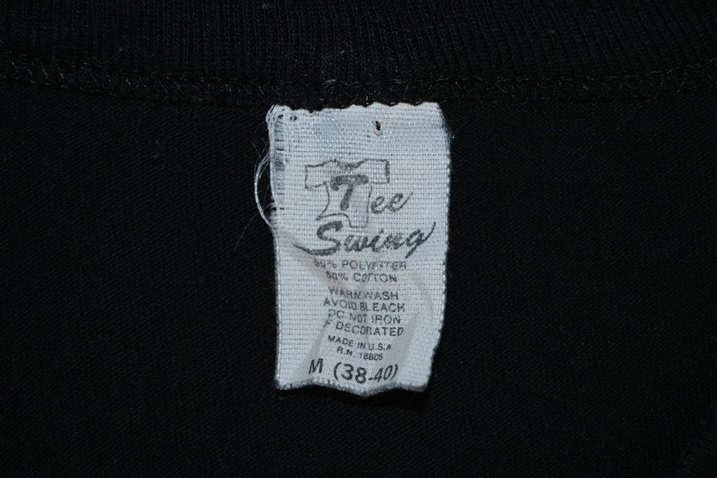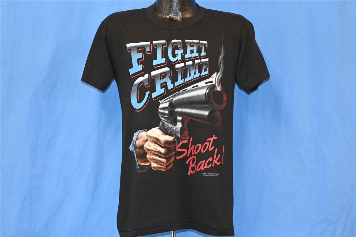 This vintage tee offers the bold and facetious philosophy to fight crime by shooting back. Great gag gift for those with a dark sense of humor and can take a joke. In true 1990s style the tee is loaded with big wild graphics, a lovely poly cotton blend, and classic Tee Swing tag. So comfy and fun to look at.