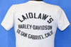 This amazing vintage tee comes from Laidlaw's Harley-Davidson dealership in San Gabriel, California. Founded by Bob Laidlaw, the small shop opened as a licensed Harley-Davidson dealer in 1958. Eventually, word spread that this unassuming shop in the San Gabriel Valley was a place where someone could get a quality Harley for a modest price and have it maintained by a qualified crew. The shop eventually moved to a much larger location in Baldwin Park, a city in Los Angeles County, where it continues to be family owned and operated.