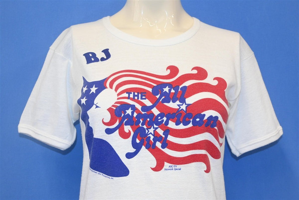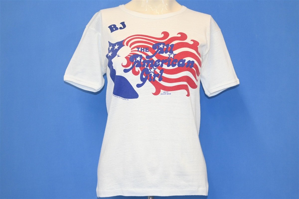 This cool women's tee supports a nation-wide beauty pageant from 1978, dubbed The All-American Girl. The competition intended to find the nation's best all-around girl, and contestants were judged on their appearance, personality, fashion taste, disco dancing, and athletic performance. Young women aged 18 to 23 were invited to compete at the local and regional level, and from those contestants, 45 women were selected to appear on The All-American Girl television special presented by ABC. Each participant was given an official certificate and a promotional t-shirt like the one here. This shirt has also been personalized with iron on letters spelling out the names Kari and BJ.