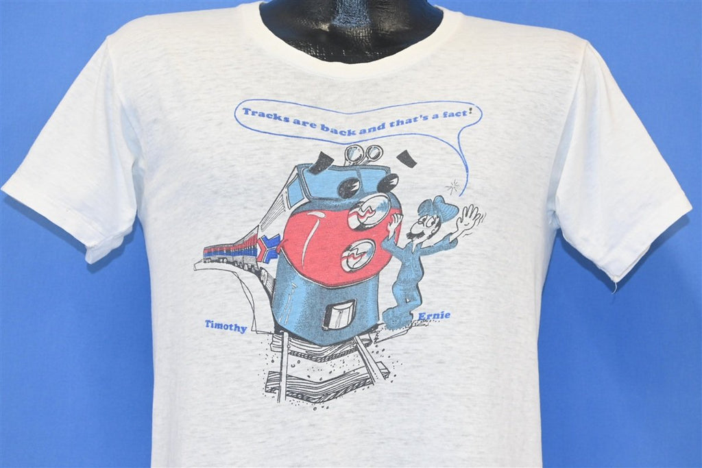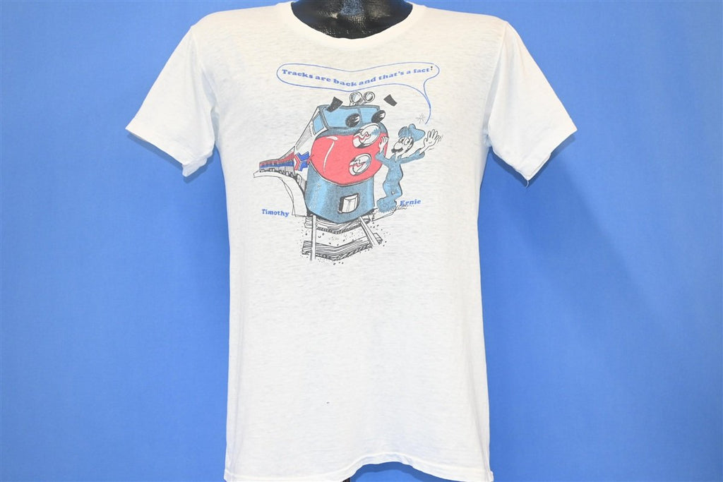 This sweet shirt was made in the 70s to advertise the national passenger railroad of the United States, Amtrak. This tee features a conductor excitedly explaining that "tracks are back and that's a fact!" Amtrak was originally founded in the 70s under the Nixon administration, although many Washington insiders had low expectations for the project. Amtrak proved to be much more popular than expected and the rail service continues to serve millions of passengers every year.