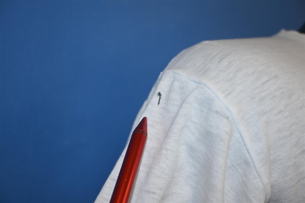 Fits like a modern unisex adult medium. There are holes on the front and the right sleeve when wearing, see pics.