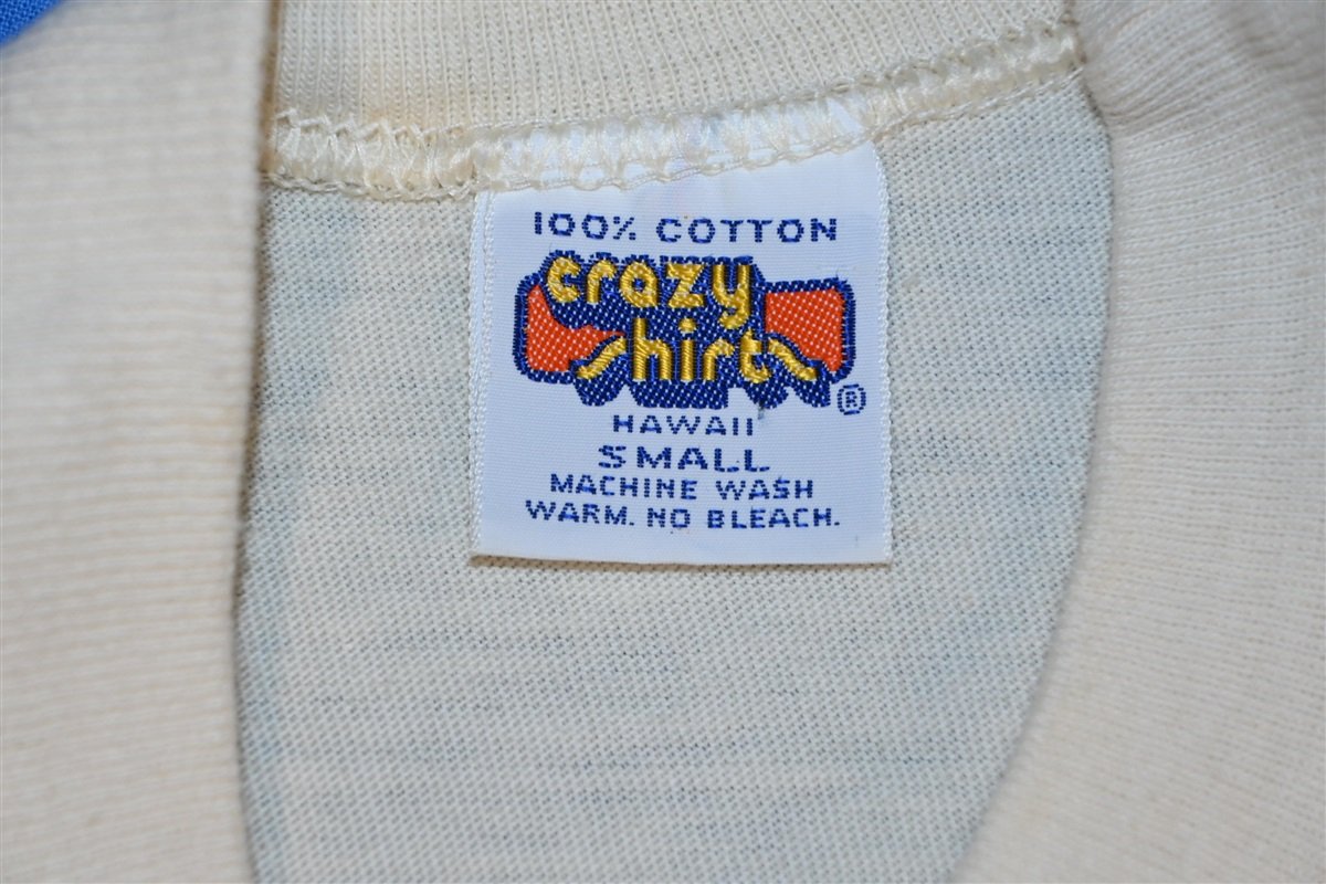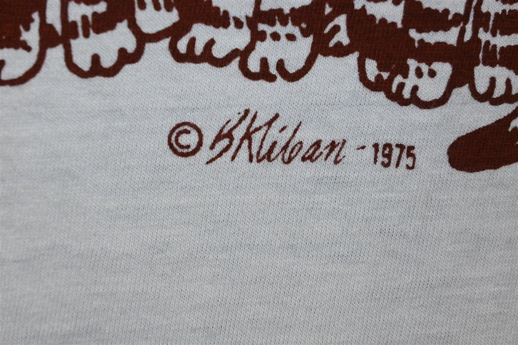 This shirt was made in the 70s, when Kliban's Fat Cat drawings first gained popularity. The shirt was printed by the Hawaiian t-shirt company Crazy Shirts, who worked with Kliban to produce a wide range of Fat Cat tees in the 70s and 80s.