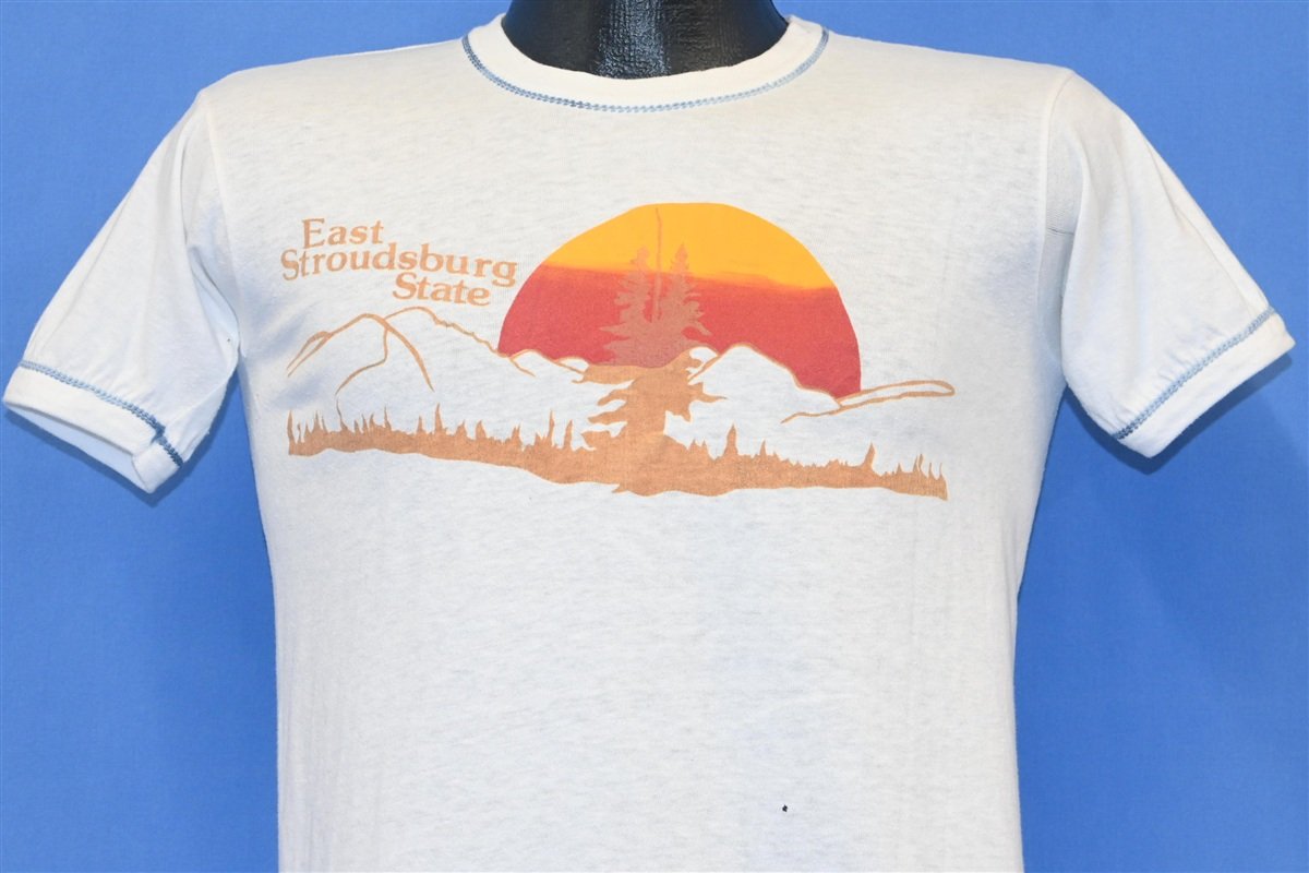 This cool tee reps East Stroudsburg State, which was the former name of East Stroudsburg University of Pennsylvania. The shirt features some stylish top stitching, and a graphic of a sunset mountain scene. The college is situated in the Pocono Mountains of Pennsylvania, and it has a history that dates all the way back to the late 1800s.