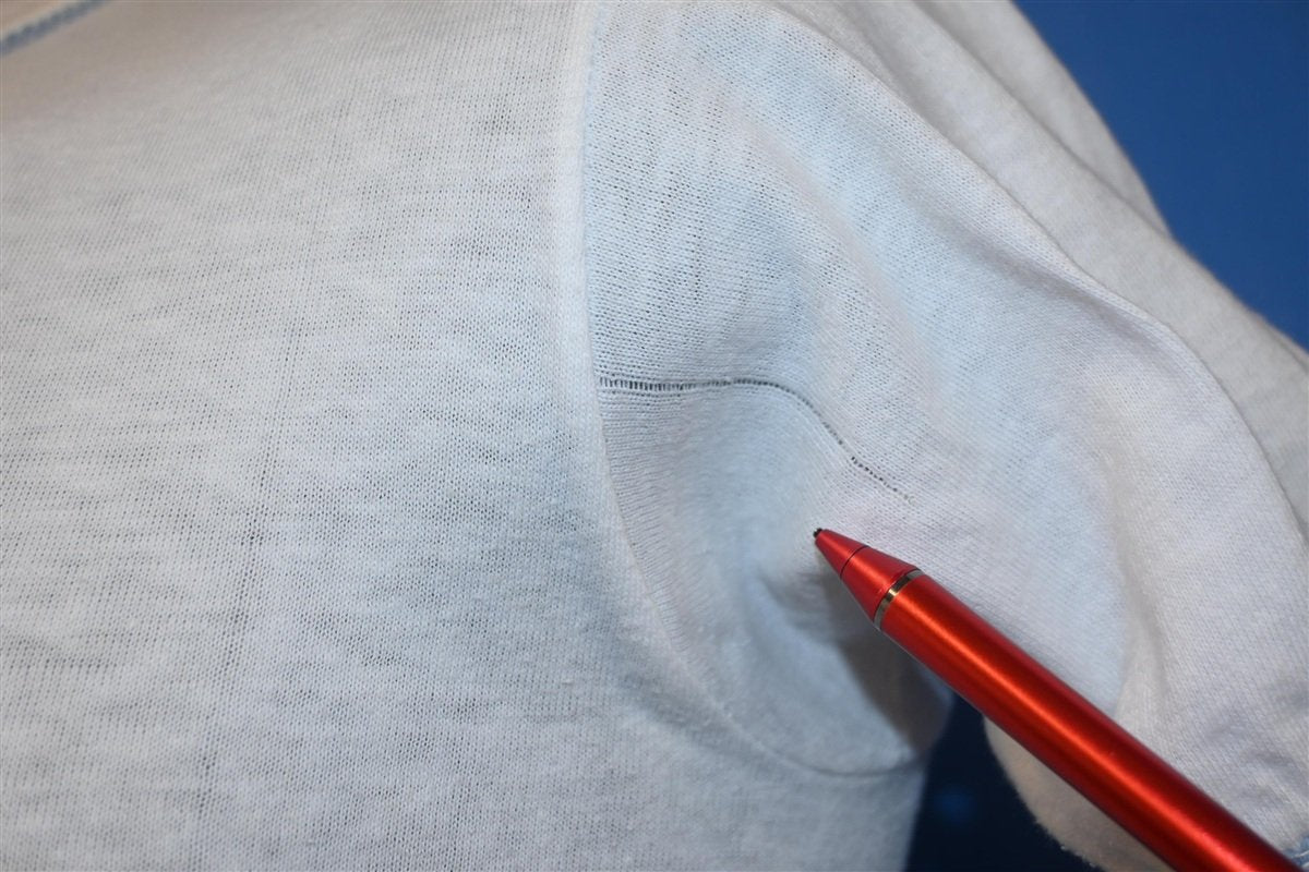 Fits like a modern unisex adult small. There's a small hole on the front and a run on the left sleeve when wearing, see pics.