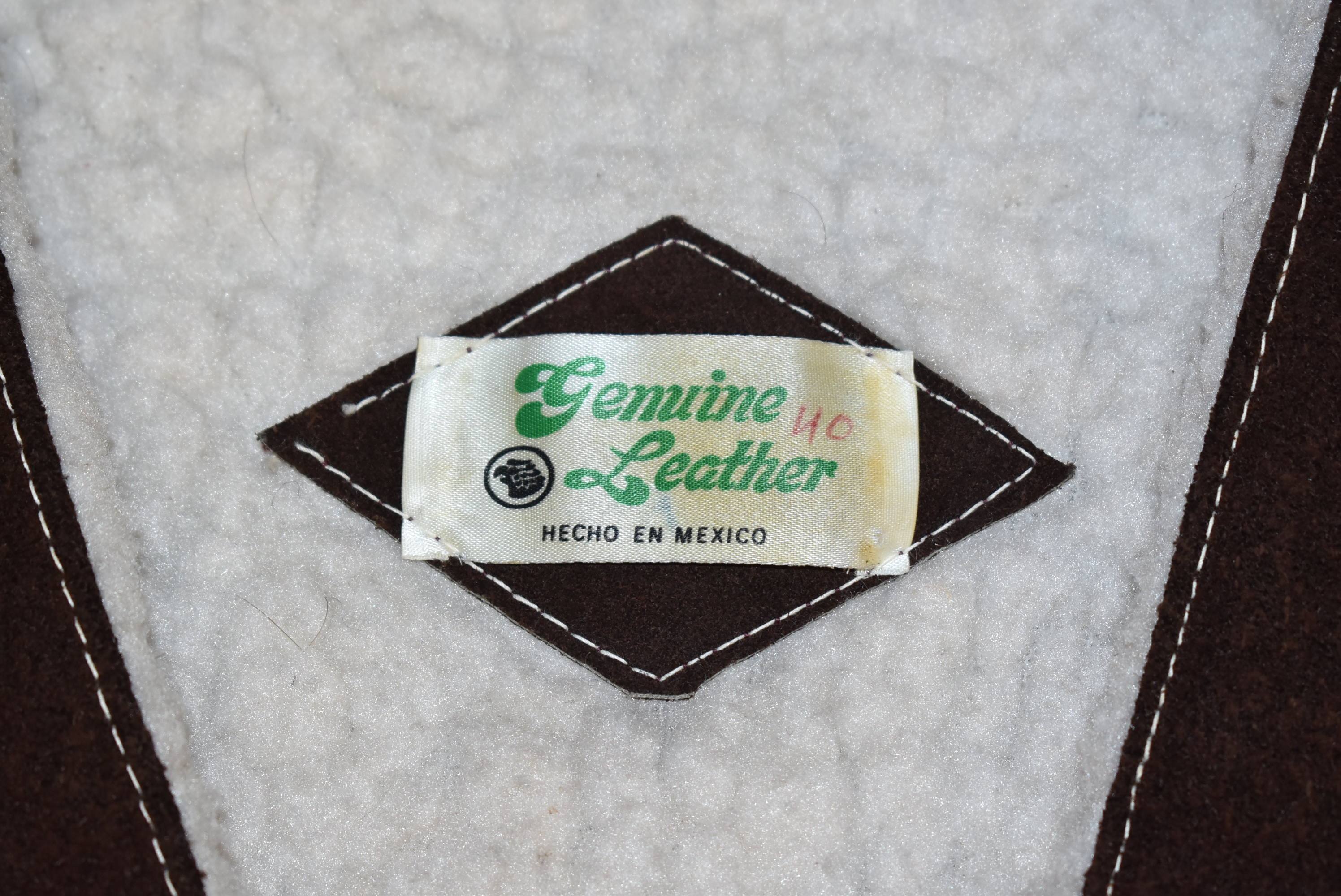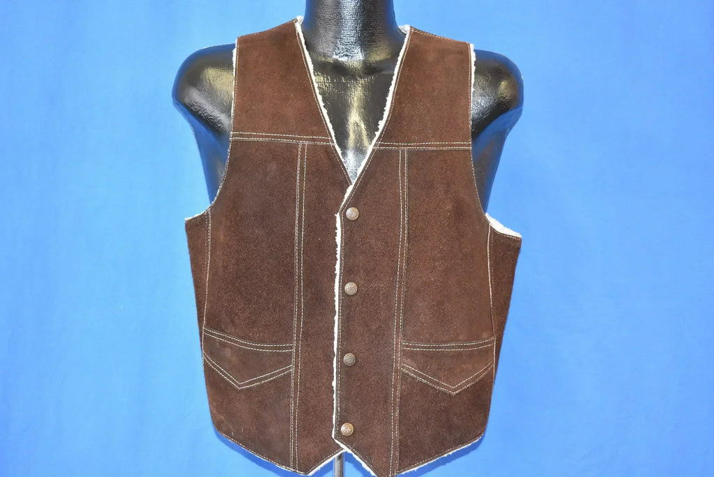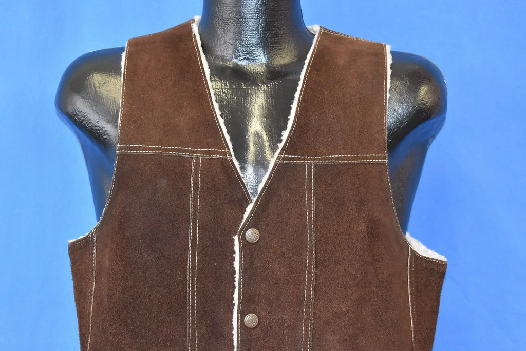 This cool brown suede vest was made by Genuine Leather in the 70s. It features some nice white stitching details and comes with Sherpa-lining to keep you nice and cozy. The front has snap up closures and flapped pockets.