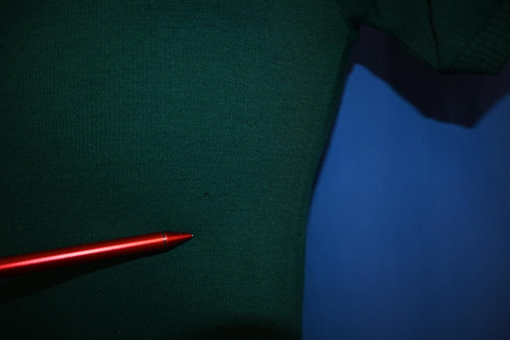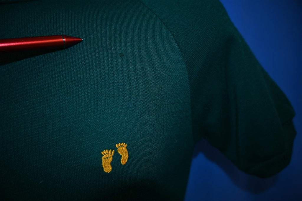 This awesome ringer was made in the 70s in a stylish, bold green. This shirt has a logo of little embroidered feet, which is the recognizable logo of the surfwear brand Hang Ten. The name hang ten comes from the surfing trick, as hanging ten is when you dangle all of your toes over the front of the board. This is also what inspired the brand's bare feet logo, and the company began in 1960 in California.