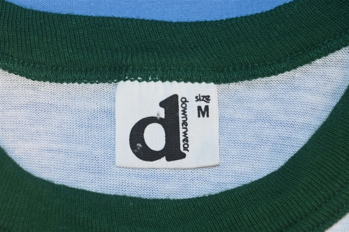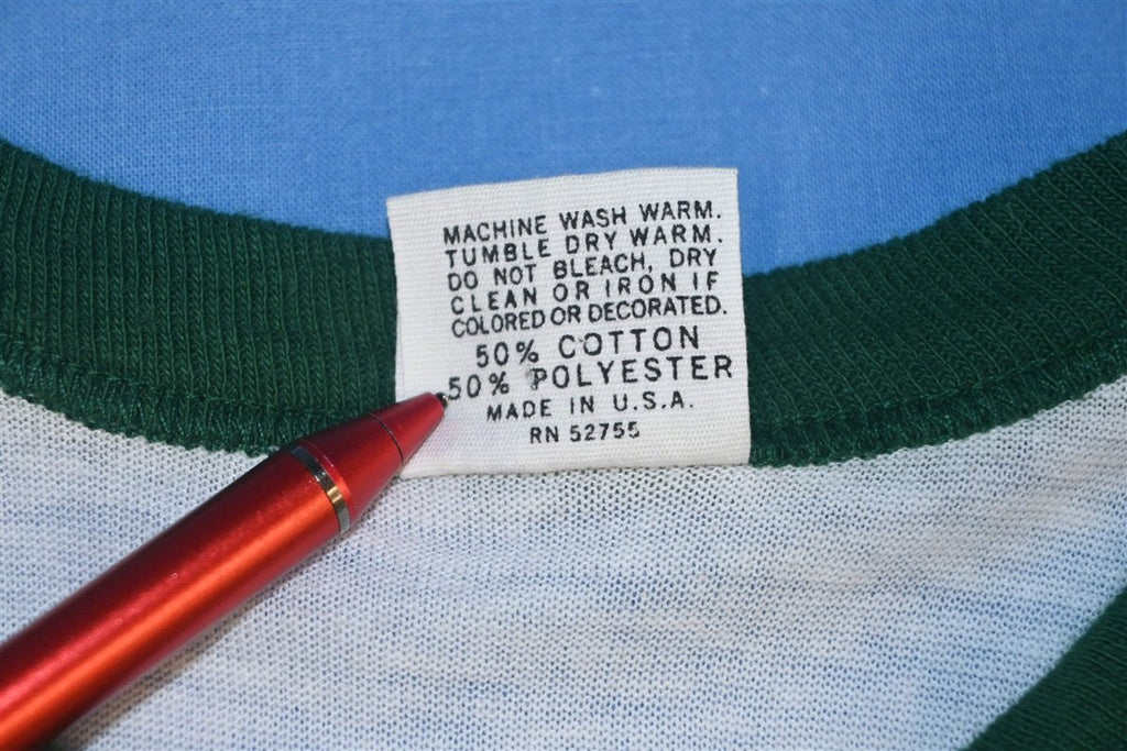 This cool vintage ringer proudly says, "I Feel Like a Giant", and it features the Jolly Green Giant. This classic character was conceived all the way back in the 1920s, when he first appeared on cans of Green Giant brand peas from the Minnesota Valley Canning Company. In 1935, the Giant was given a makeover by Leo Burnett, that made him much more friendly-looking and also added the "Jolly"moniker to his name. This tee features the Giant as he appeared during the early 70s, which was also the era in which he was given a companion, Sprout. The younger, more sprightly mascot was introduced in 1972 to help Green Giant vegetables appeal to kids.