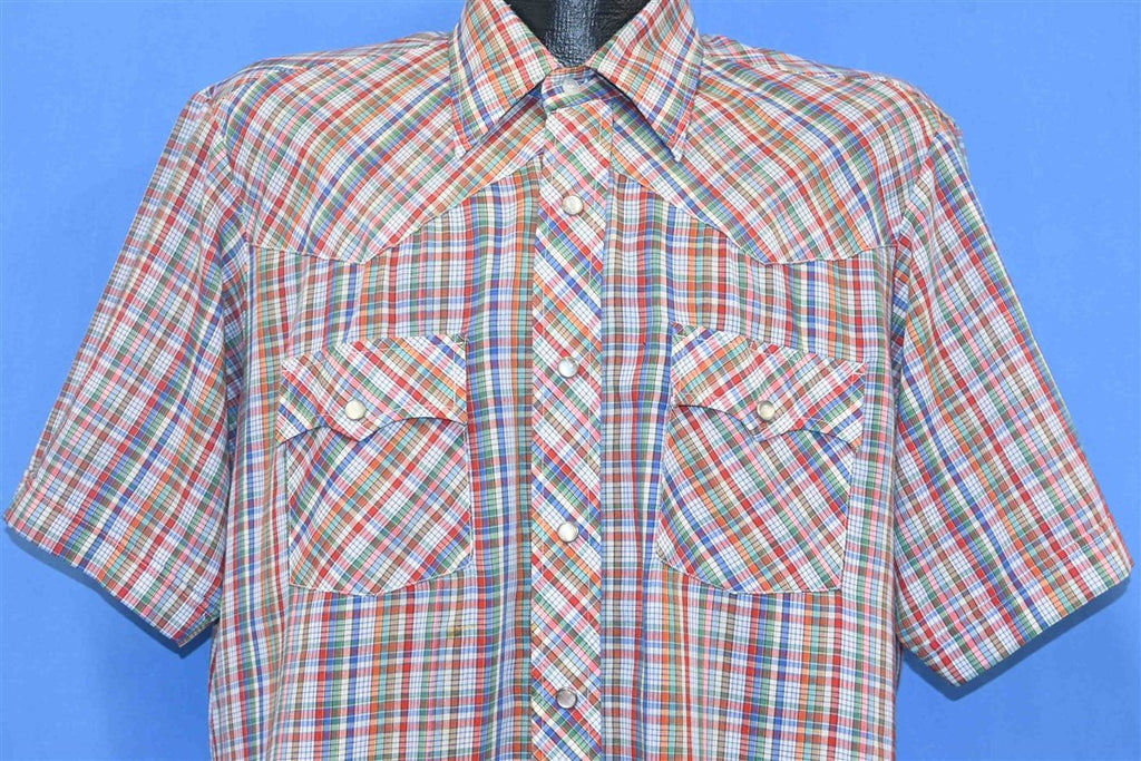 This sweet short sleeved cowboy shirt was made back in the 70s, and it rocks a 70s style oversized collar. This shirt also has a colorful plaid design and pearl snap closures. It has two flapped chest pockets and western style yokes on both the front and the back.