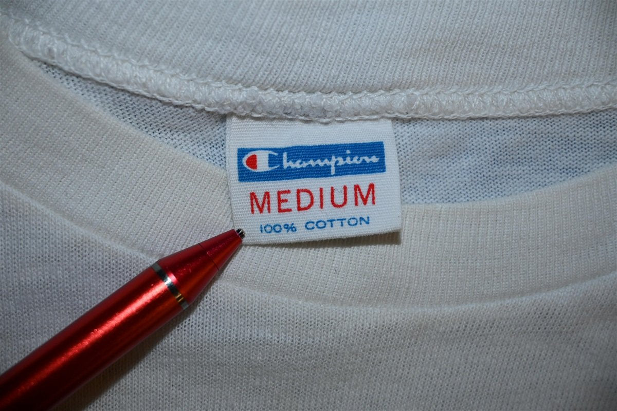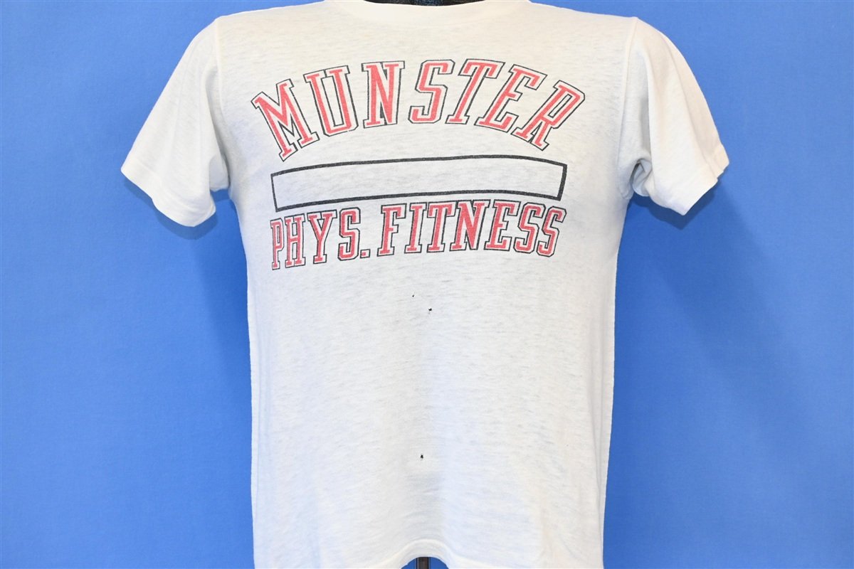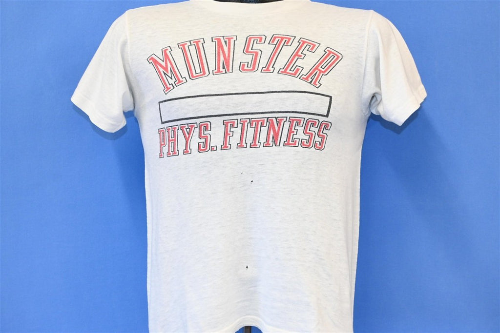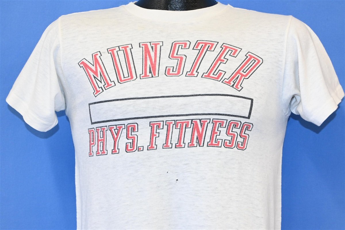 This vintage tee is a classic cotton shirt from the brand Champion, and it features their Blue Bar tag. This shirt is a standard gym uniform from the 1970s, and it proudly reads, "Munster Phys. Fitness". The shirt also includes a space where a student could personalize the uniform with their name. This tee hails from a time when physical education uniforms were common practice for most public school's and Champion was considered a titan of the industry. The company had long since established themselves as one of the nation's top athletic apparel manufacturers and by the mid 20th century they were also producing innovative pieces like the mesh jersey and the sports bra.