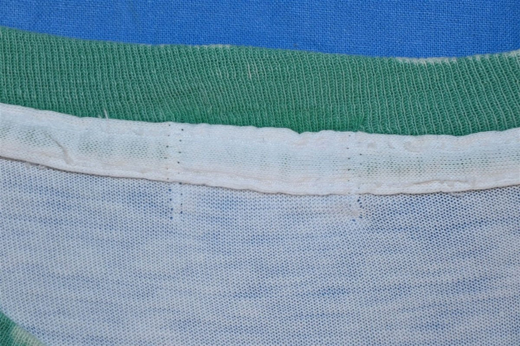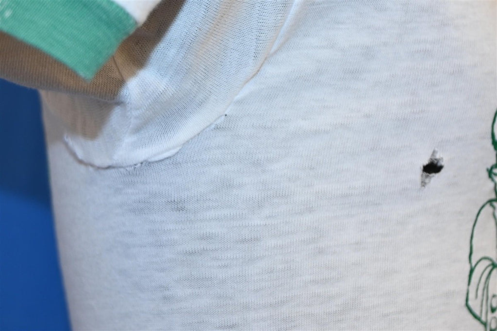 This cool distressed ringer is from a 70s Cheerleader Camp. This tee has a great look with an awesome leprechaun graphic and a personalized back. The back of the tee has a cheerleader megaphone with the name Shelly. It's likely that this tee was worn by a counselor or coach. Cheerleading history goes back to American colleges at the end of the 19th century. At that point the cheerleaders were called "Yell Leaders" and they were exclusively men.