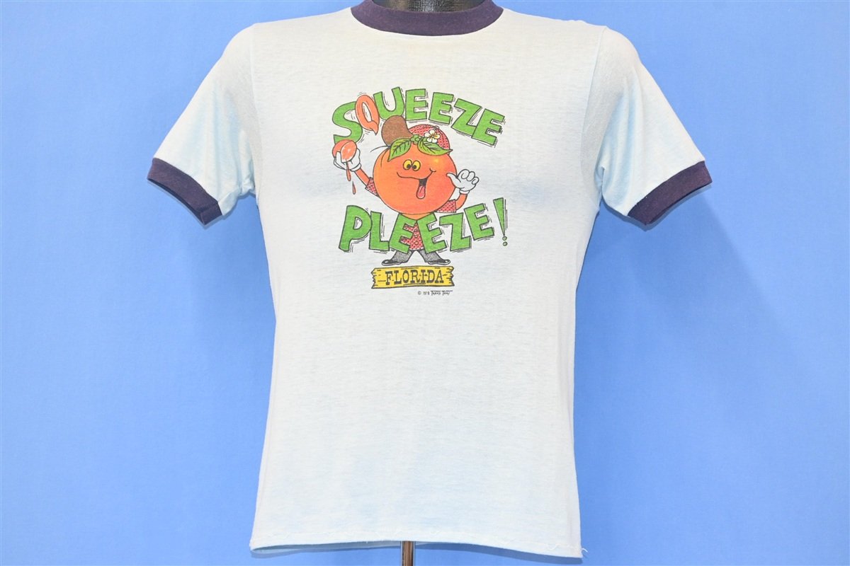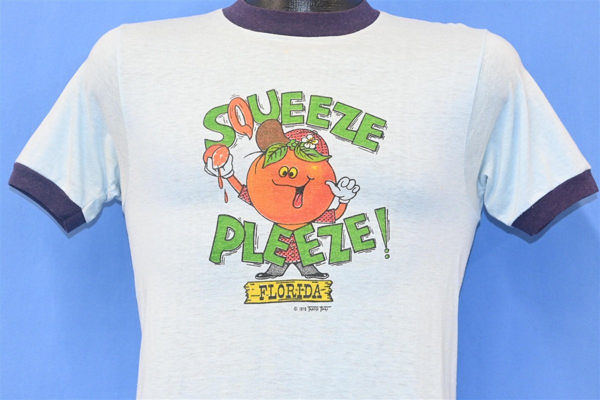 70s Squeeze Pleeze Florida Orange Juice Blue Ringer t-shirt Small