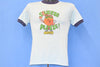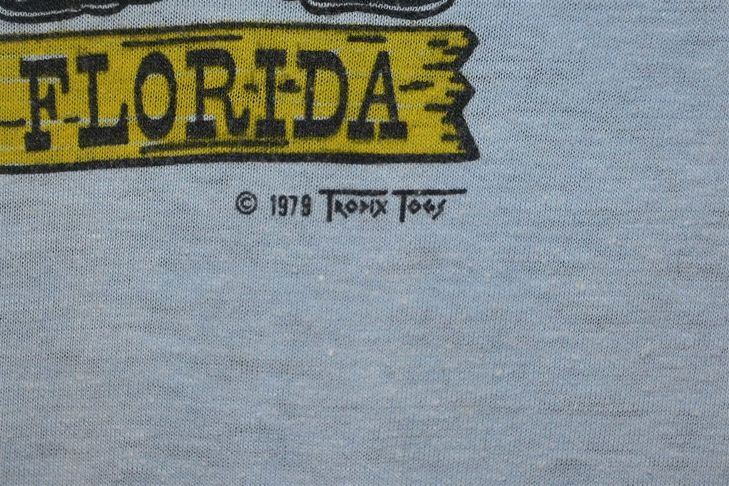 This cool vintage ringer was made by Tropix Togs in the late 70s. The shirt features a grinning cartoon orange with the caption, "Squeeze Pleeze!" and it's a great example of the sort of advertising graphics that were made to promote Florida's citrus industry around that time. For most of the 70s, Florida's orange juice sales thrived thanks to a series of popular commercials starring Anita Bryant. However, Bryant lost her contract with the Florida Citrus Commission, after she become the public face of the Save Our Children campaign, which vocally opposed the gay rights movement. Not wanting to be associated with Bryant's anti-gay beliefs, Florida Citrus looked to new advertising ventures.