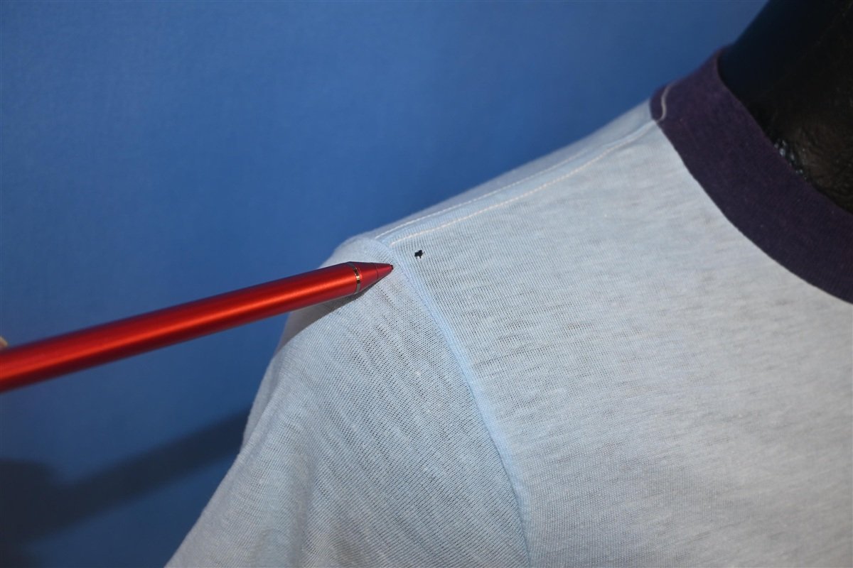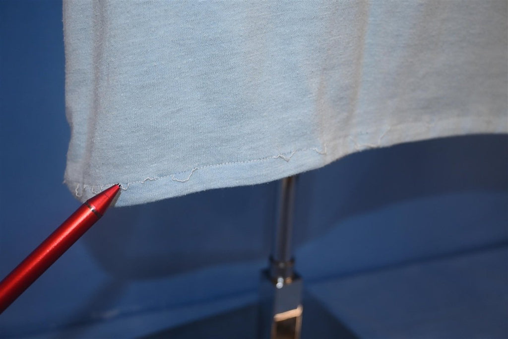 Fits like a modern unisex adult small. There's some wear along the bottom, discoloration on the back, and a small hole on the right shoulder when wearing, see pics.