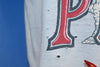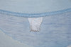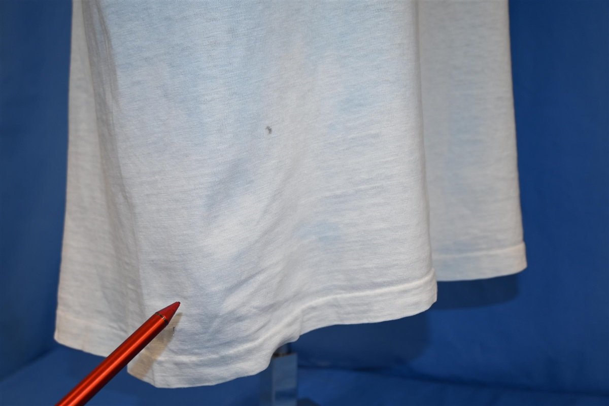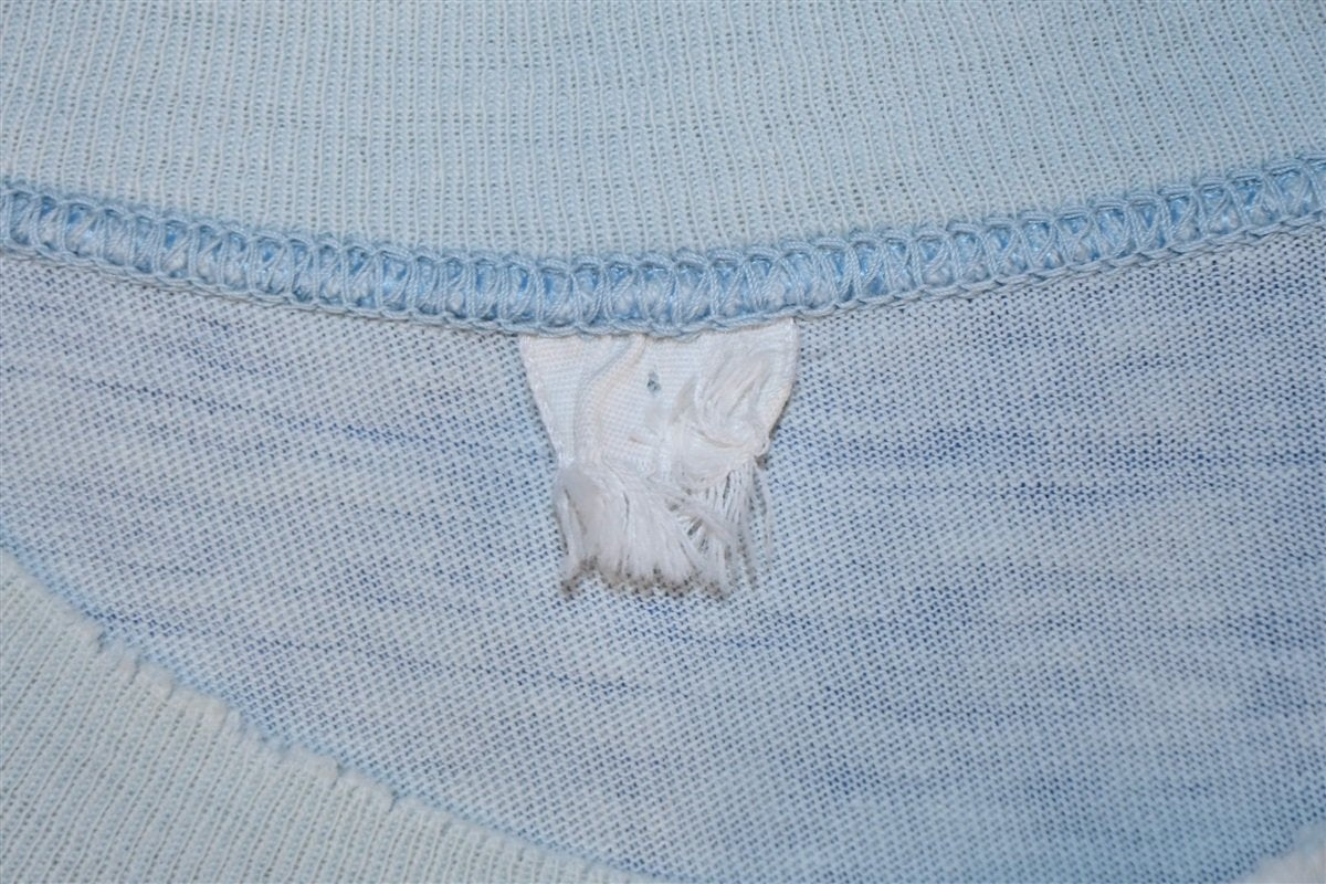 Fits like a modern unisex adult large. This shirt is very light blue in color. It is thin and distressed with holes and discoloration throughout, see pics.