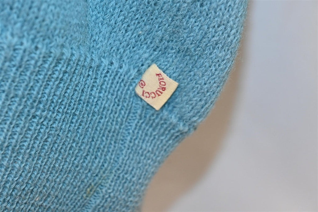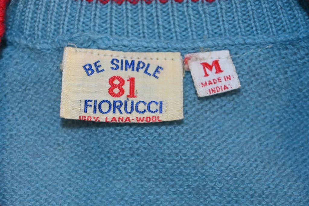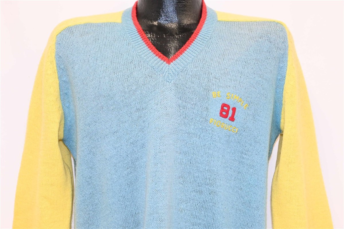 This delightfully soft wool sweater was made by the Italian fashion label Fiorucci, which gets its name from its founder Elio Fiorucci. This sweater features a v-neck collar and some colorblocked sleeves. It also has the words "Be Simple Fiorucci 81" stitched onto the chest, suggesting that the sweater was made in 1981. That was the same year that they began selling licensed Disney apparel, and they also sponsored Simon and Garfunkel's reunion concert in Central Park.