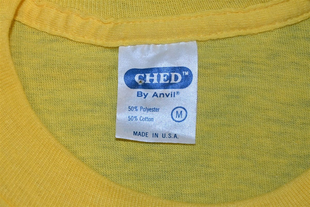 This sweet shirt is a classic promotional tee for the Crazy Eddie consumer electronics chain. Catering to the Northeastern US, Crazy Eddie used to be famous for its viral radio and TV ads featuring the eponymous Crazy Eddie character. However, the advertisements actually starred a radio DJ by the name of Jerry Carroll, who based his frantic sales patter on the used car salesman Earl "Madman" Muntz. Meanwhile the name Eddie actually came from the chain's co-founder, Eddie Antar who earned the nickname Crazy Eddie thanks to his aggressive sales techniques.