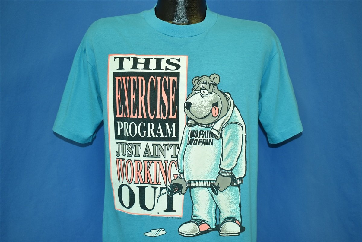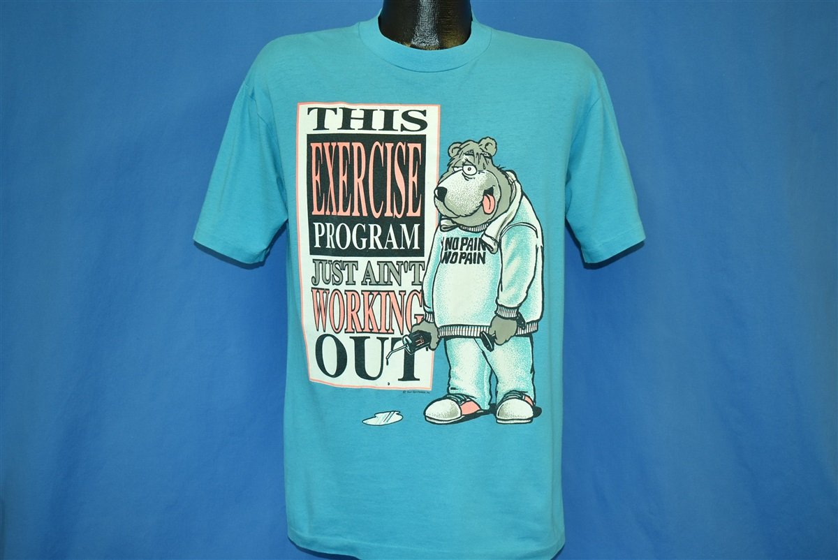 This 80s vintage tee features a hilarious double entendre some may relate to. The graphic shows a cartoon bear in a sweatshirt and sweatpants looking exhausted and delirious. The sentiment goes, "This exercise program just ain't working out."