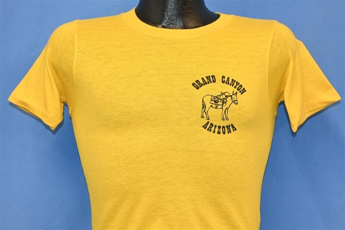 This fun t-shirt features a graphic of a donkey to promote the Grand Canyon in Arizona. The back says "Go hike the Canyon, Grand Canyon National Park." The canyon was carved by the Colorado River in Arizona and has grown in depth to that of a mile down, width of 18 miles across, and a length of 277 miles. The river cut through layers and layers of rock to show off the strata of over 2 billion years of sediment. Most scientists believe that the Colorado River started eroding the channel over 6 million years ago. The Grand Canyon is a iconic and well-known tourist attraction thats pulls in over 5 million visitors every year.