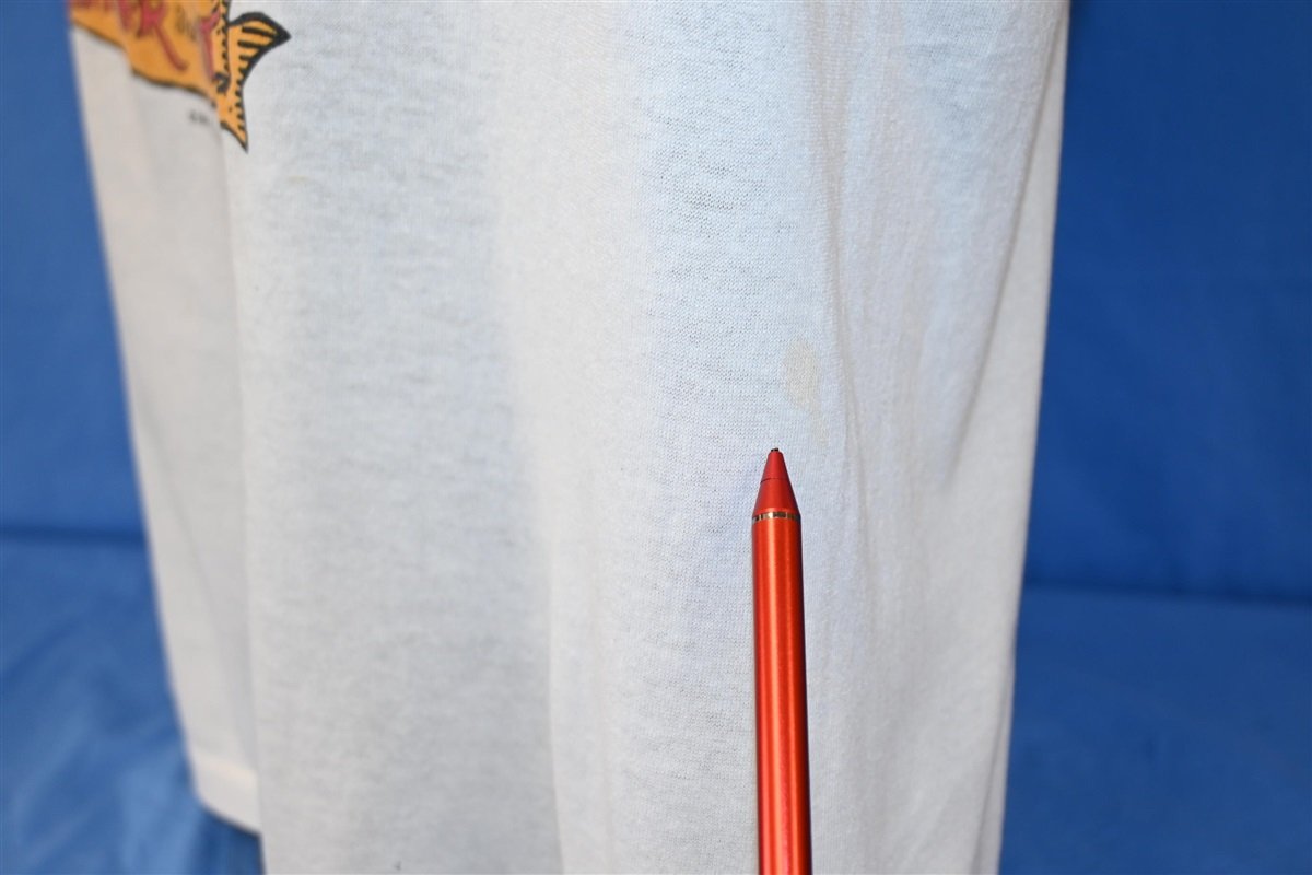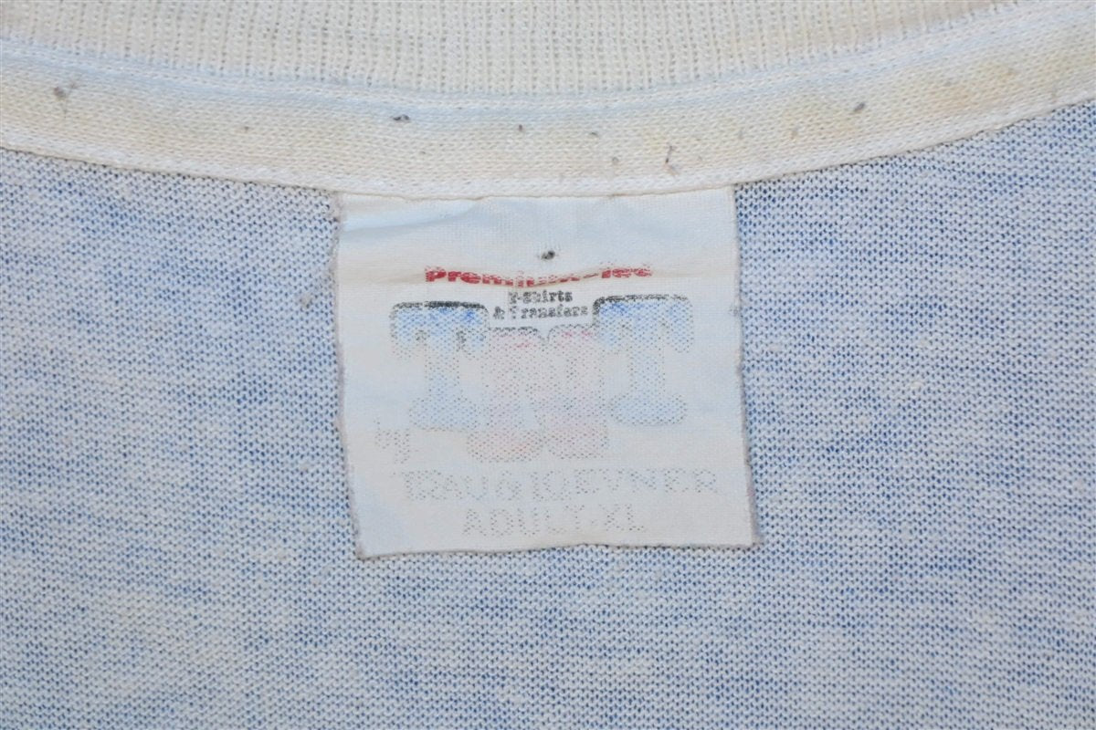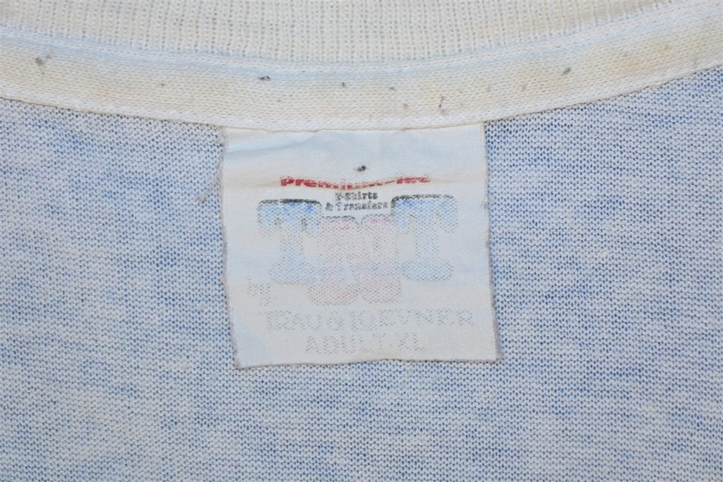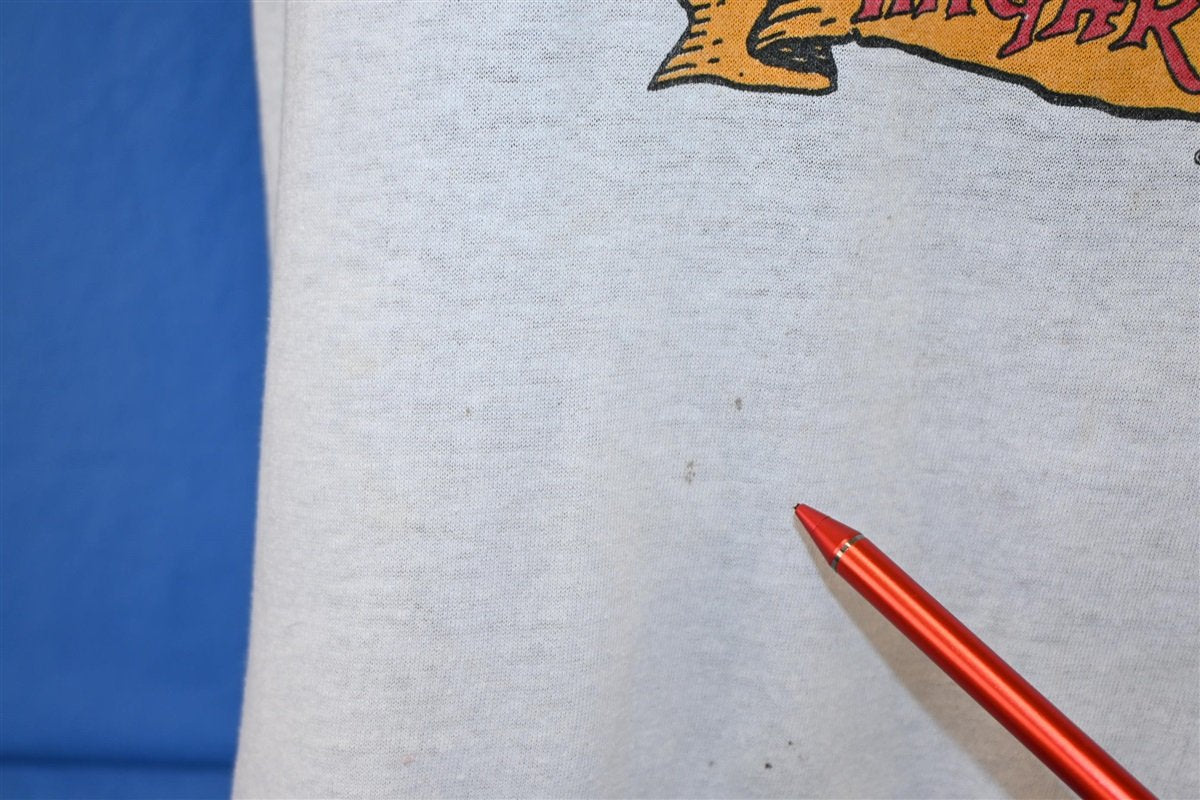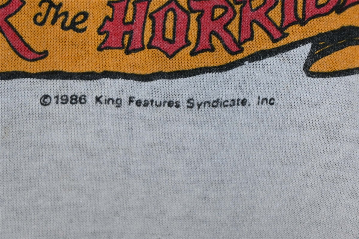 This fun vintage shirt declares "Let's Party" and it has a graphic of Hagar the Horrible, the titular character of the Dik Browne comic strip of the same name. Hagar the Horrible first appeared in the Sunday papers in 1973 and over the years it has been syndicated by King Features, the same company that owns the licenses to other beloved titles like Beetle Bailey, Blondie, and Popeye. Hagar the Horrible follows the adventures of a medieval viking, and the strip's title was actually inspired by a nickname bestowed upon Dik Browne by his sons. The name given to Browne was actually "Hagar the Terrible", but the cartoonist chose to change it for the sake of alliteration.