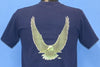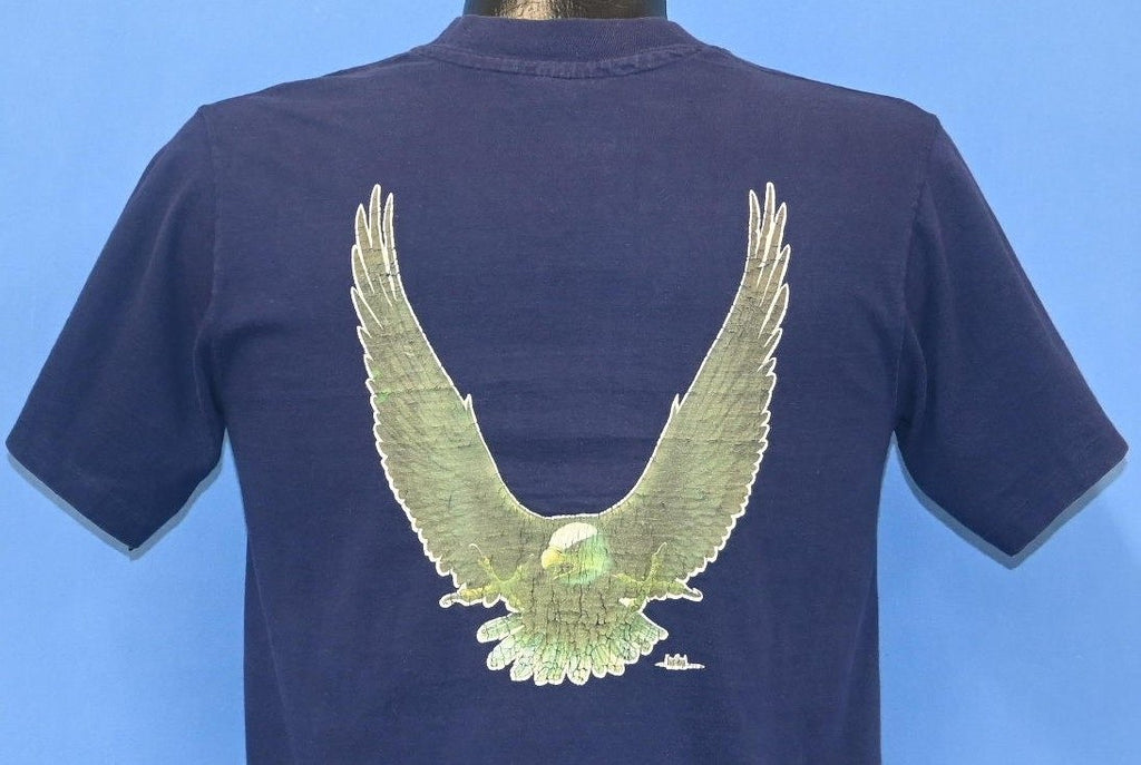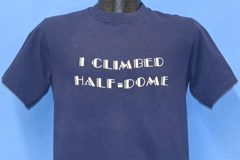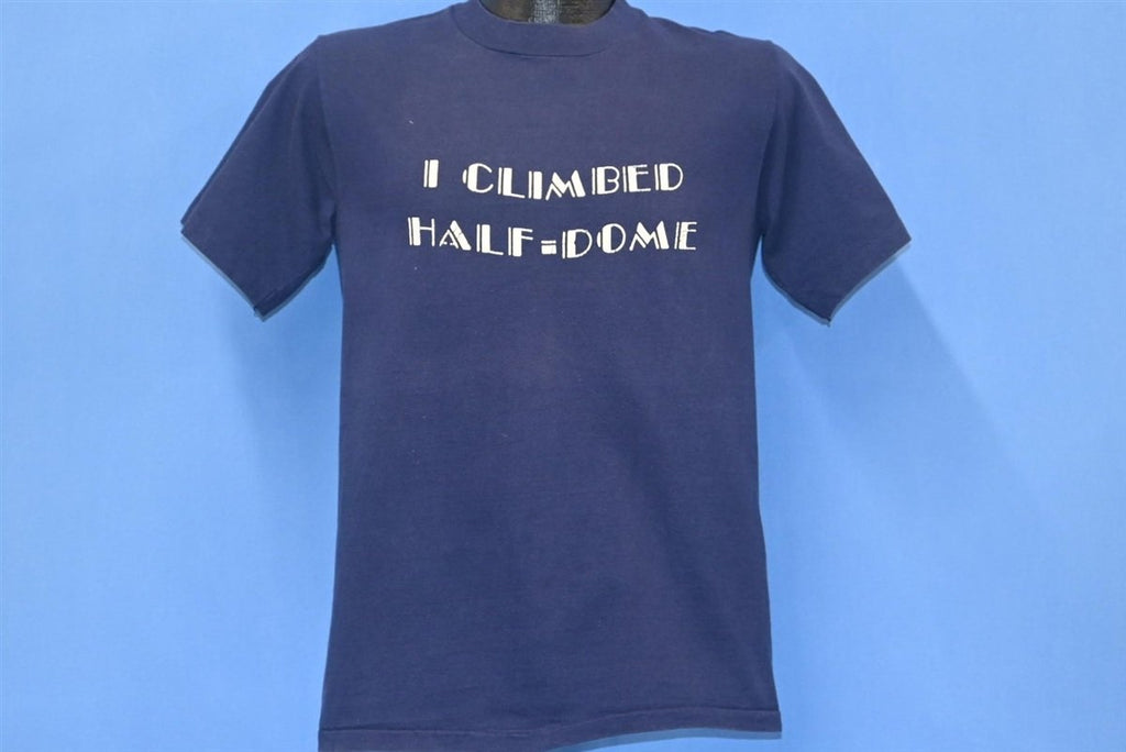This cool vintage tee proudly reads, "I climbed Half Dome", and it refers to the famous rock formation located at the eastern end of Yosemite Valley in Yosemite National Park. Thanks to its unique shape, Half Dome is one of Yosemite's most iconic landmarks, and it attracts large crowds of daring hikers with its challenging climb. The final ascent of the dome requires visitors to climb up a steep cable route, but those who make it get to relax and enjoy the stunning views from the dome's flat top. The back of this tee also features an iron on decal of a bald eagle, that was made by the t-shirt brand Roach.