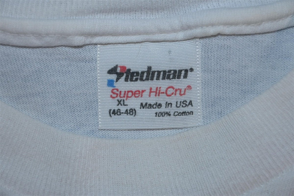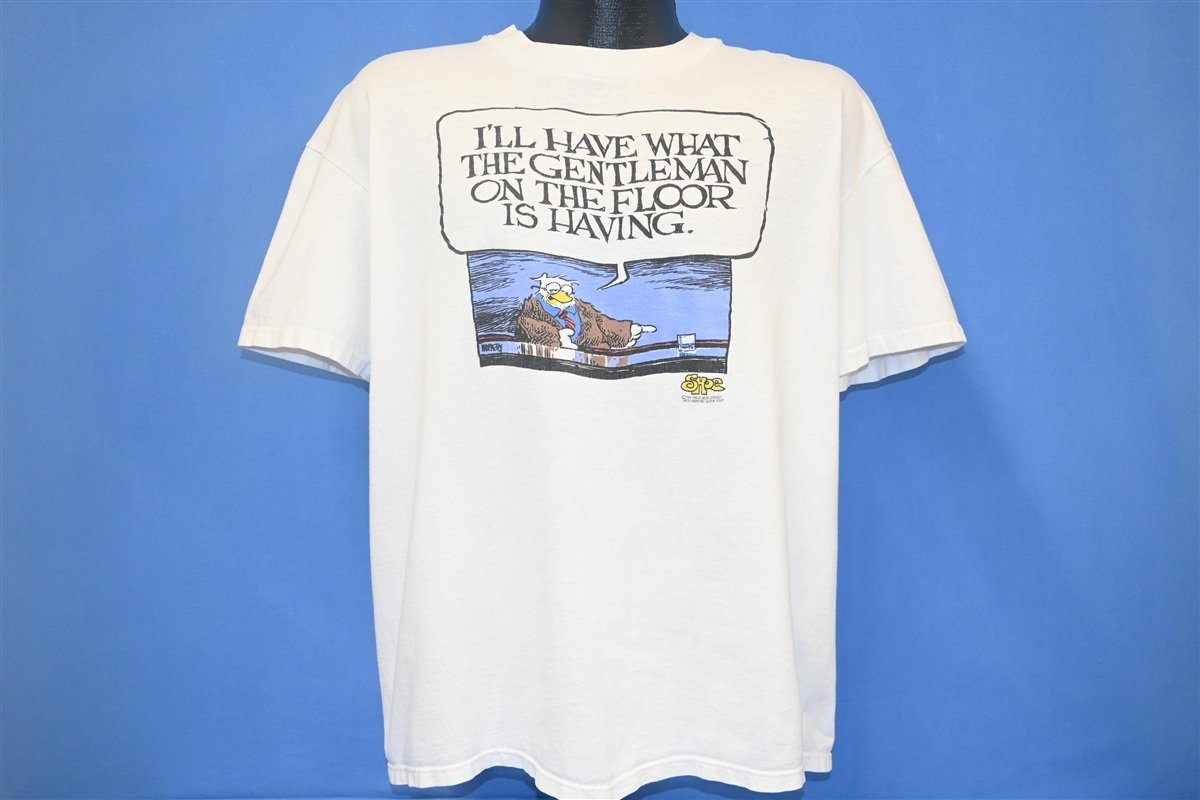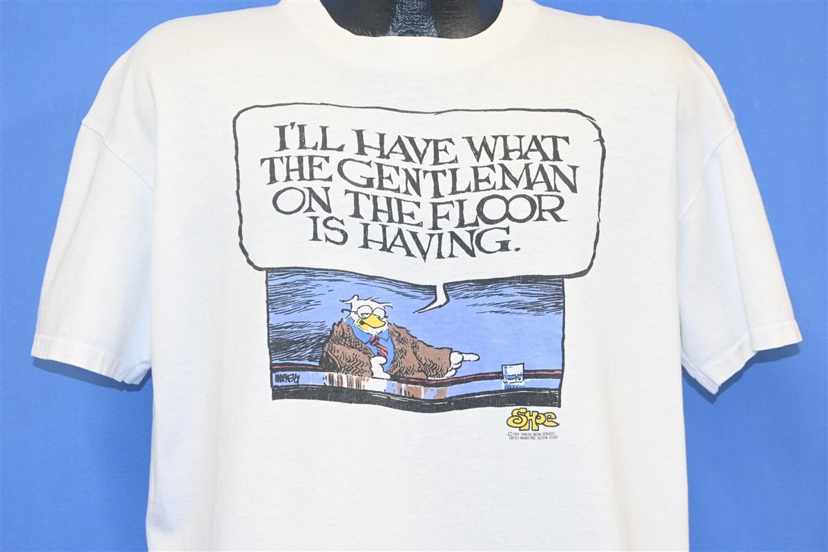 This humorous shirt features Professor Cosmo Fishhawk from the comic strip Shoe, created by Jeff MacNelly. The tee shows the Perfessor ordering a stiff drink at the bar by requesting, "I'll have what the gentleman on the floor is having". Shoe was introduced in 1977, and the comic centered on a group of anthropomorphic birds that lived in the fictional town of Treetops, East Virginia.