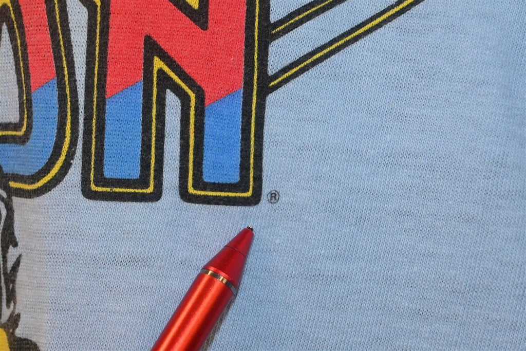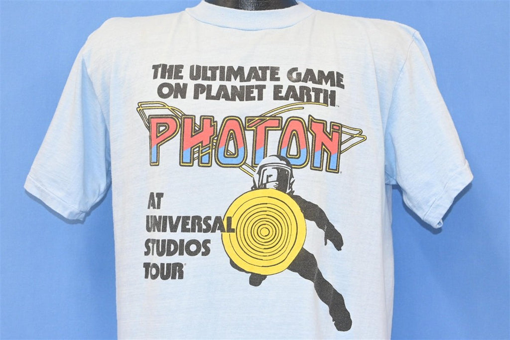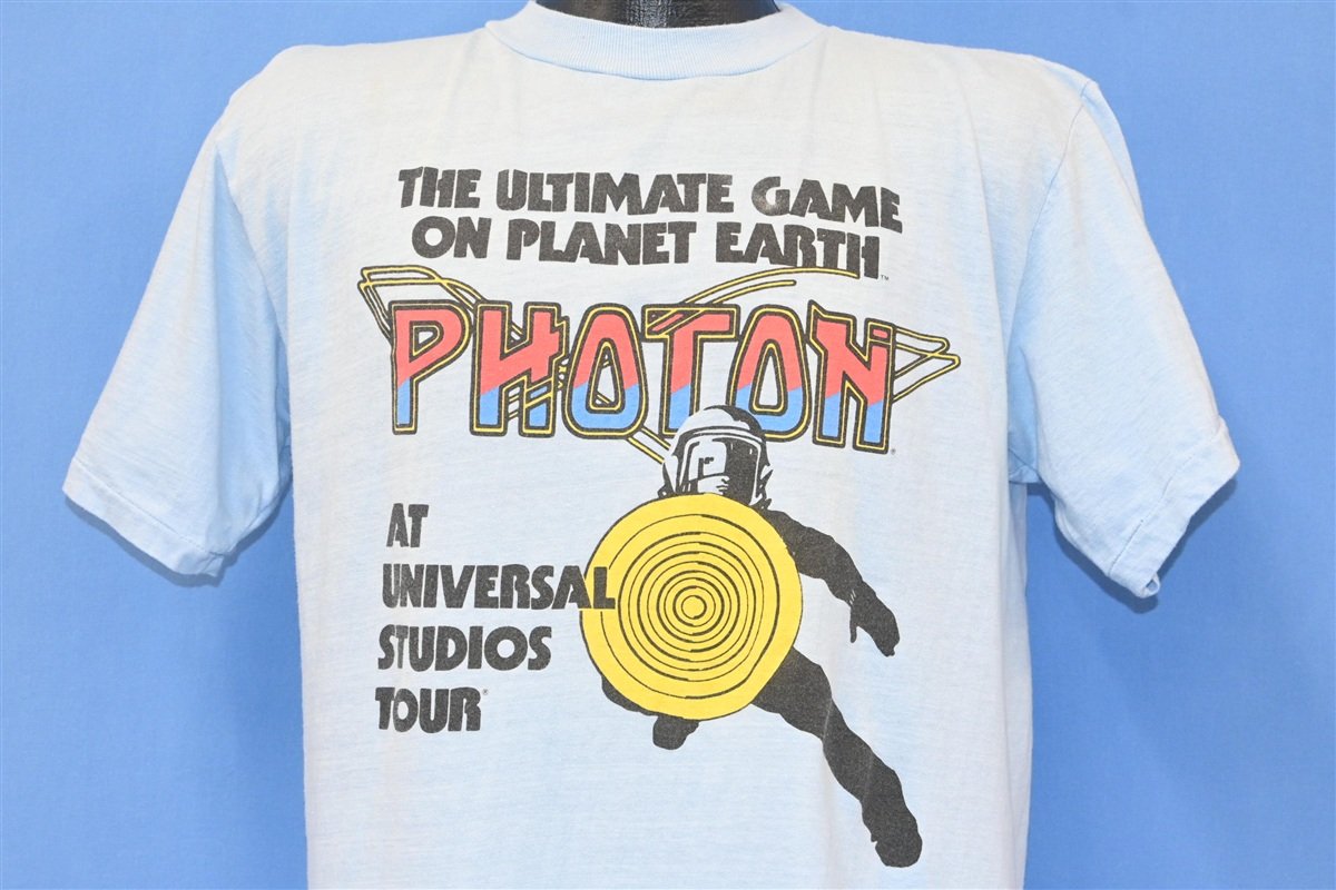 This sweet t-shirt is a souvenir from the Universal Studios Tour in Hollywood, and it promotes Photon "The ultimate game on planet Earth". Photon was one of the earliest commercial laser tag games, and it was developed by George Carter III, who took inspiration from the original 1977 Star Wars. A home version of the game hit the markets in 1986, right alongside its competitor Lazer Tag, and both became one of the hottest selling toys of the Christmas season.