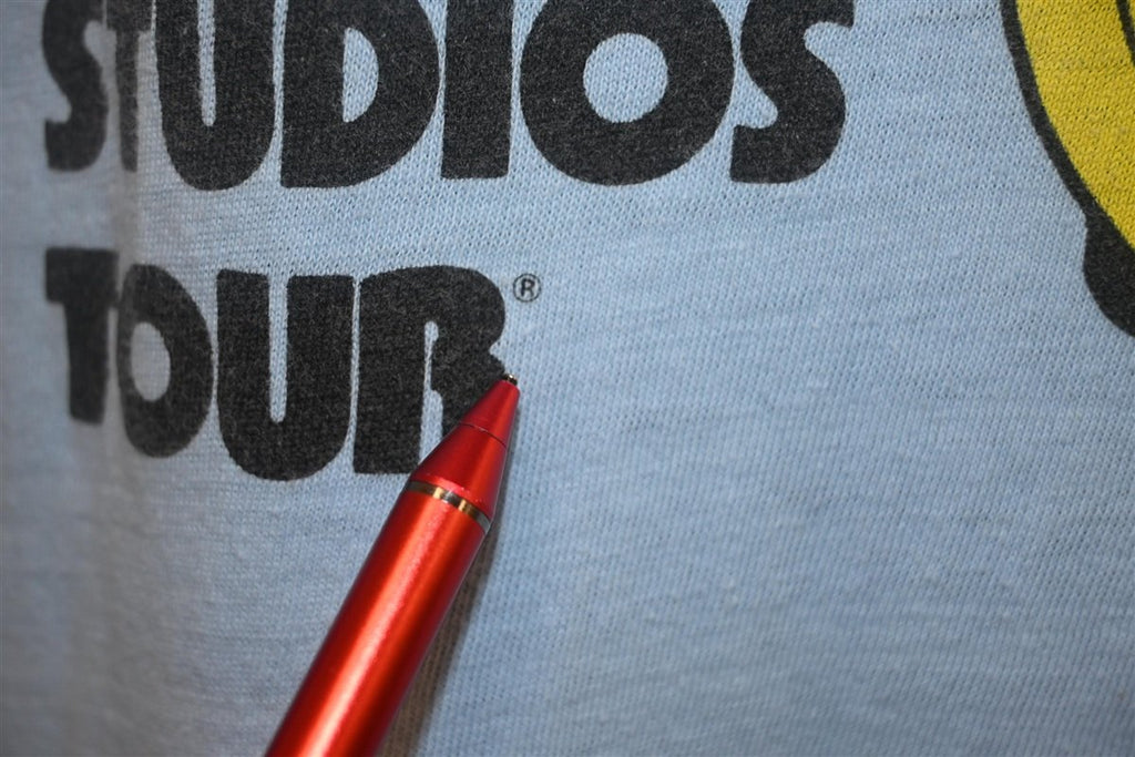This shirt promotes the Photon Laser Gallery that was opened at Universal Studios in 1987. It was the largest of several Photon game centers across the US, and the first one to be opened in Southern California. The gallery offered a high tech and immersive space for Universal guests to play the game. Players were split into two teams, and they could compete in six minute long matches just steps away from where K.I.T.T. from Knight Rider was housed on the upper lot.