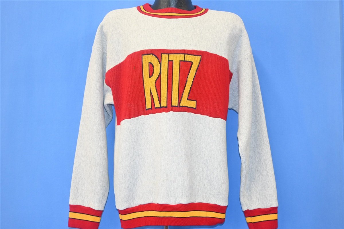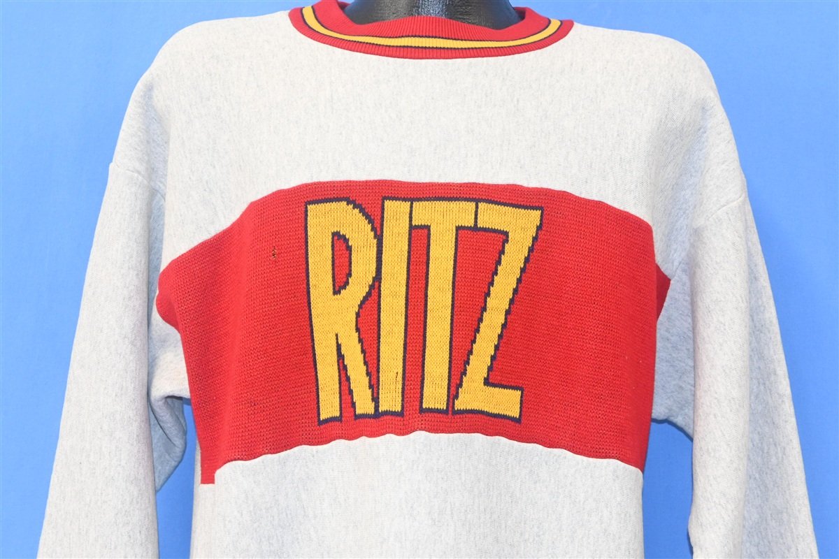 This incredible sweatshirt rocks a reverse weave material and knitted design honoring Ritz Crackers. This delicious Nabisco snack was created during the Great Depression in the 1930s. Tasked with creating a cracker that could stand up to their competitor, Sunshine Biscuits, the company introduced Ritz and marketed them as "an affordable taste of luxury" amidst economic hardship.