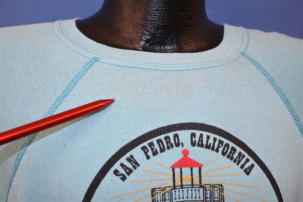 This cool raglan sweatshirt commemorates the centennial celebration of the San Pedro community in Los Angeles. In 1988, San Pedro held a year-long celebration that honored the neighborhood's 100th anniversary. While San Pedro was originally founded as a separate city, it was later consolidated into Los Angeles in 1909. However this didn't deter San Pedro residents from celebrating the community's history in 1988.