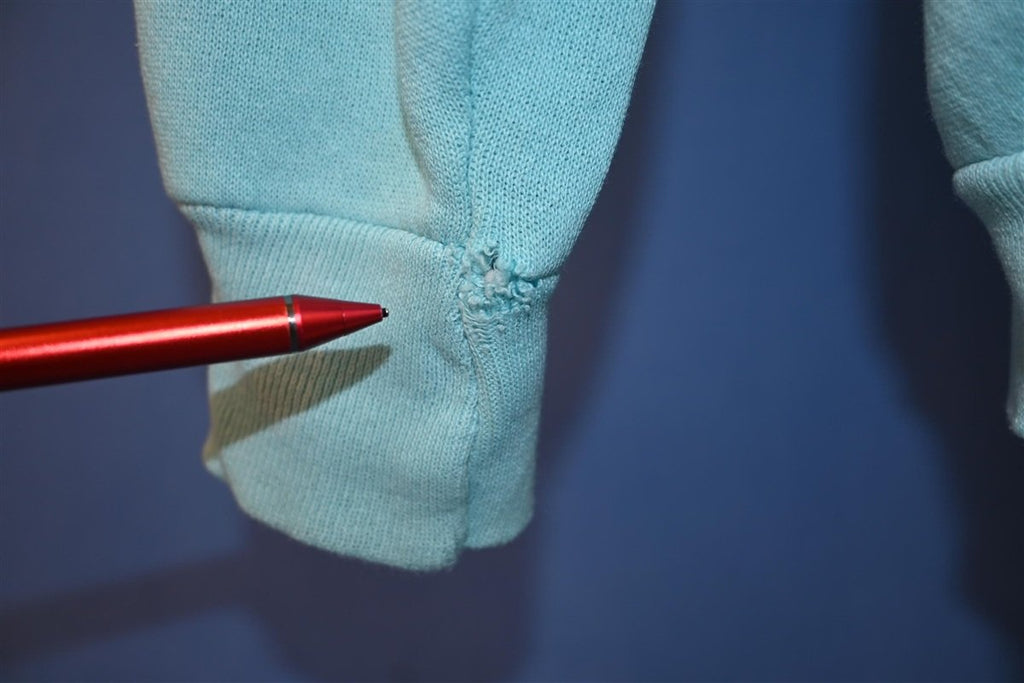 Fits like a modern unisex adult large. There is some light discoloration on the front, and holes on the left cuff and left underarm when wearing, see pics.