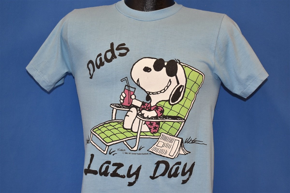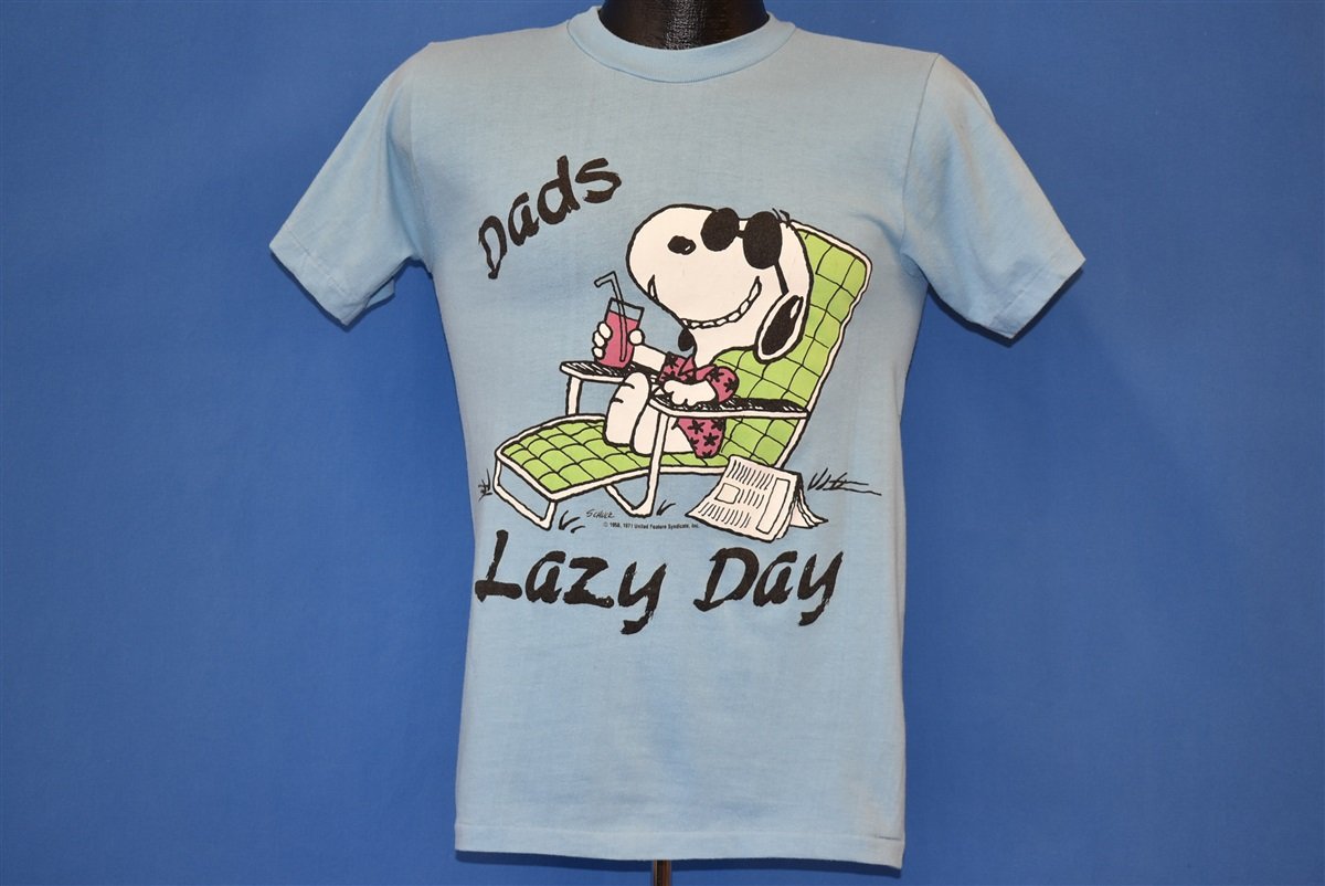 This cartoon shirt has a graphic on the front of Charles Schulz' character Snoopy lounging on a lawn chair with a newspaper and a drink. It says "Dad's Lazy Day". In the Peanuts comics, Snoopy is Charlie Brown's pet beagle. Snoopy's best friend is Woodstock, a small yellow bird.