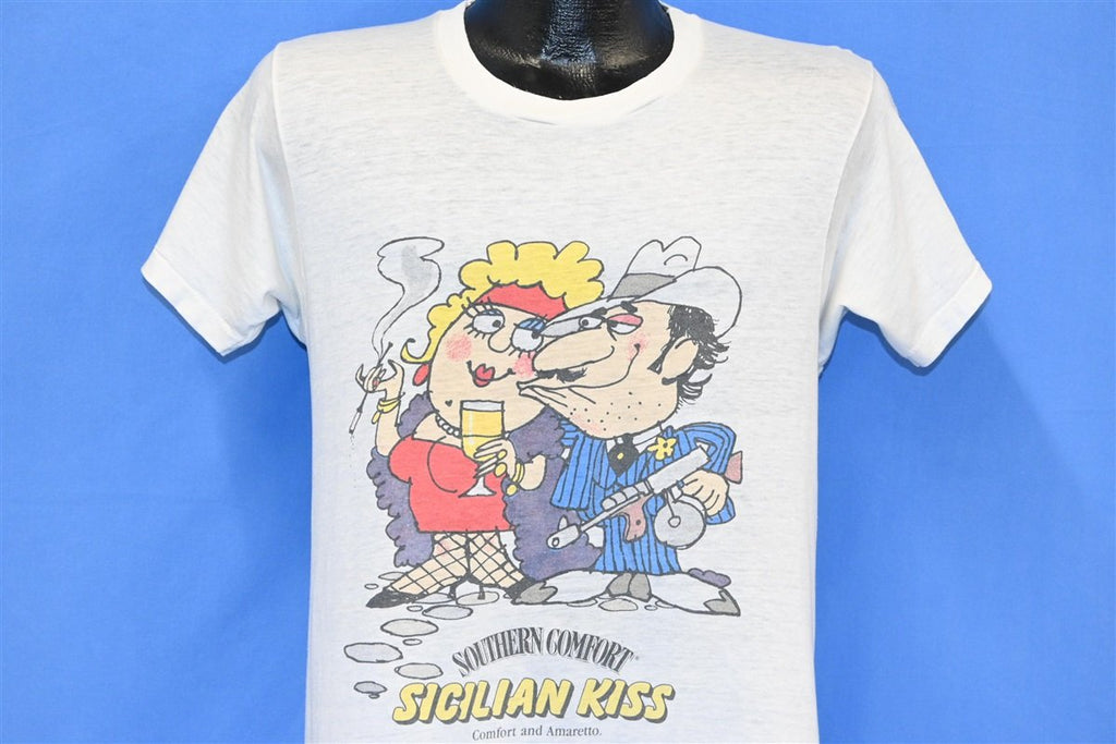 This super soft tee promotes a cocktail called the Sicilian Kiss. Described as delightfully smooth, the Sicilian Kiss is a drink that combines Southern Comfort and Amaretto, and it's typically topped with a twist of orange. This shirt features a graphic from Southern Comfort advertising the drink.