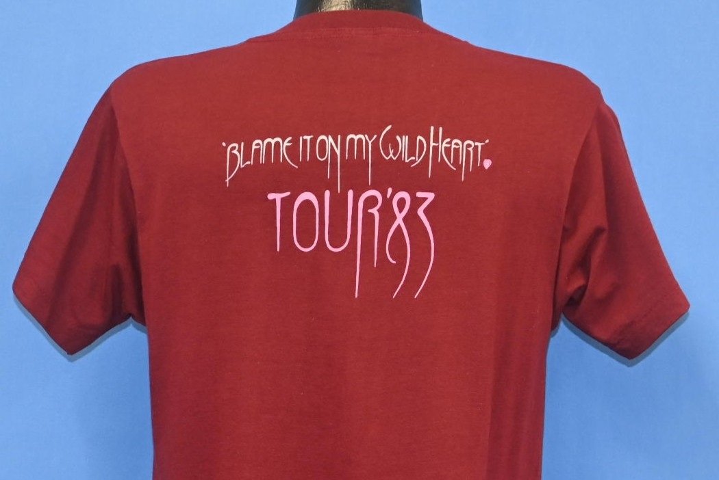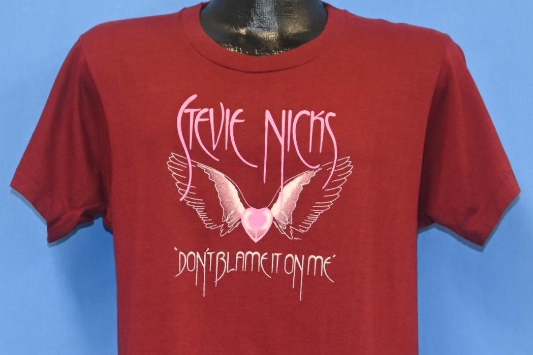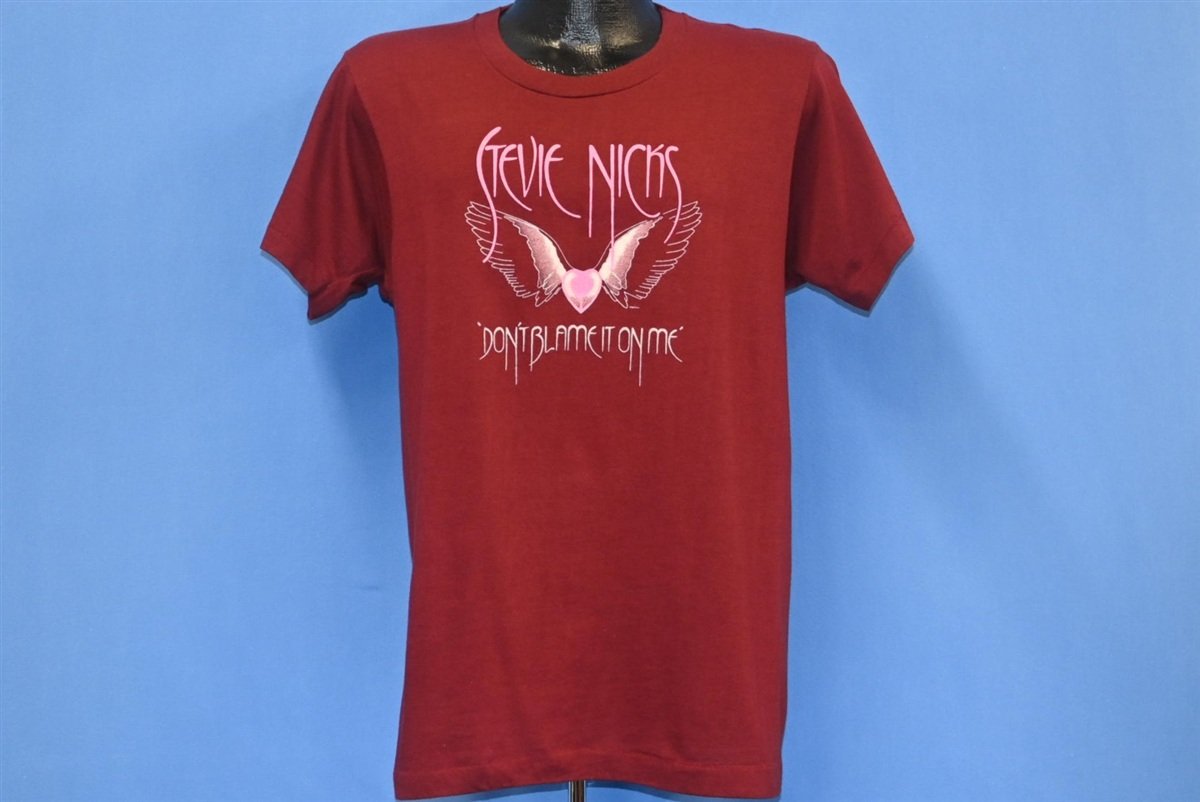 This cool maroon tee commemorates a 1983 concert tour for the celebrated musician, Stevie Nicks. The tour was launched to promote her second solo album The Wild Heart, and this shirt features lyrics from the titular track that say, "don't blame it on me blame it on my wild heart". Nicks began recording The Wild Heart shortly after the completion of Fleetwood Mac's Mirage Tour, which promoted the band's album of the same name. After the tour, Fleetwood Mac went on a hiatus that lasted for several years, while its members pursued their own solo projects.