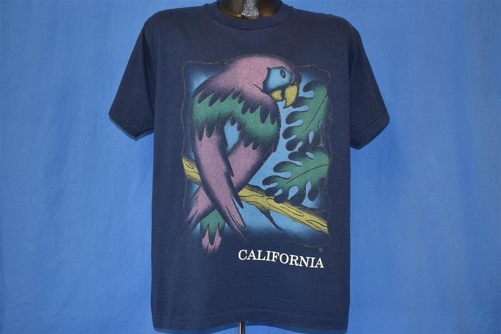 Wild parrots, like the macaw on this tee, are especially common in Southern California. They were originally imported as pets, escaped into the wild, and continued thriving in the out there. Among the most common species are Lilac Crowned Parrots, Rose-ringed Parakeets, and Yellow Headed Parrots.