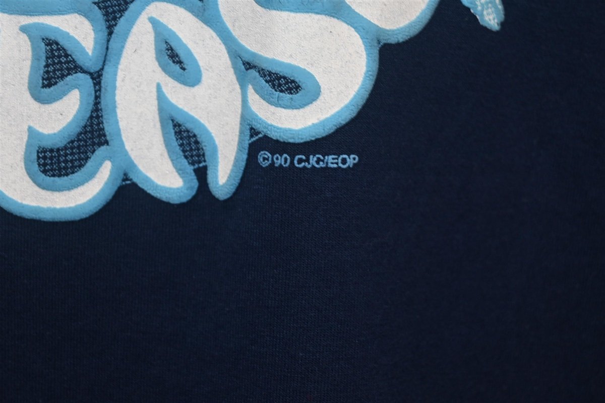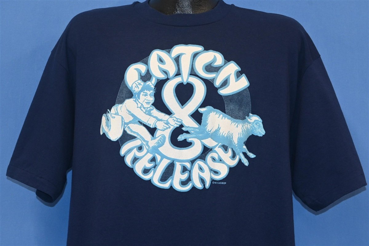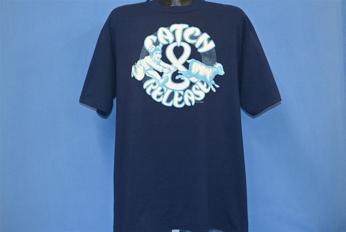 This cool vintage tee has a unique graphic of a sheep running away from its keeper, and the image is accompanied by the words, "Catch & Release". This term is sometimes used to refer to instances where criminal offenders are released back into a community before they face criminal proceedings. This shirt's copyright includes the acronym CJCJ, which likely refers to the Center on Juvenile and Criminal Justice, a California based nonprofit dedicated to justice reform and reducing incarceration. It's likely that this shirt was made to support the CJCJ's efforts to prioritize community-based care over detainment.