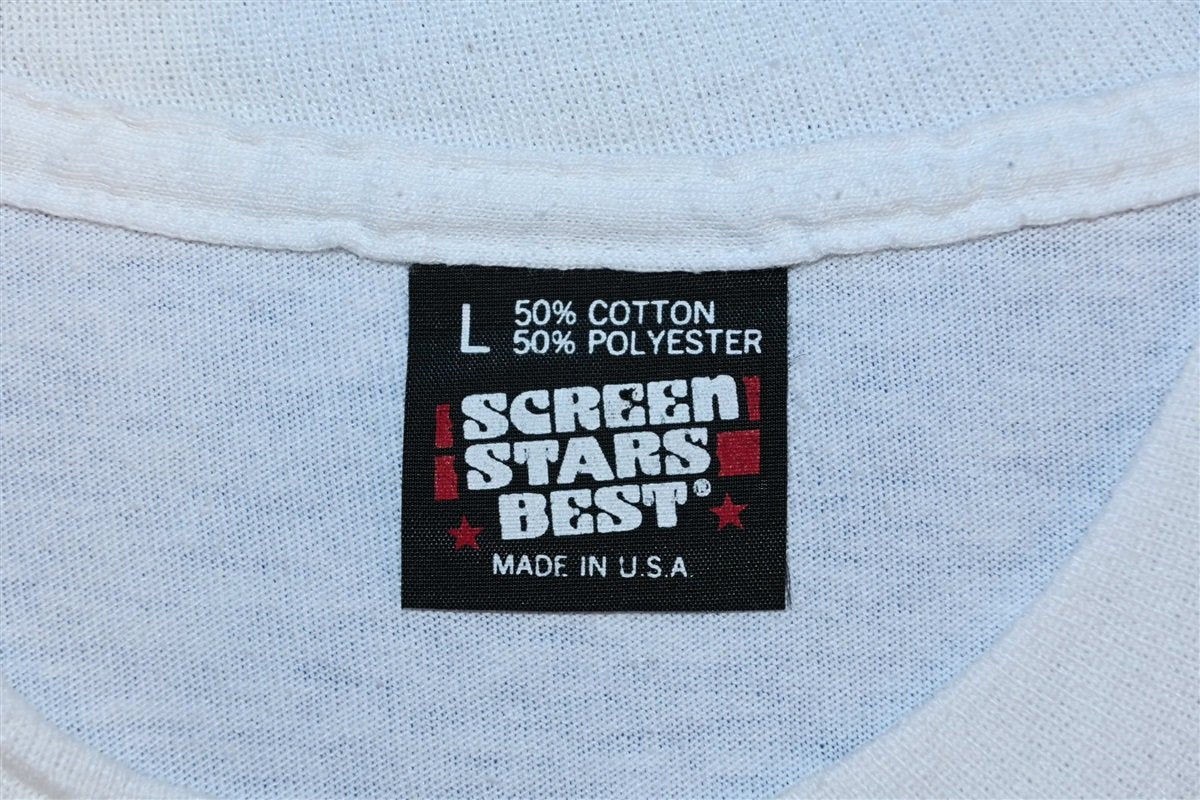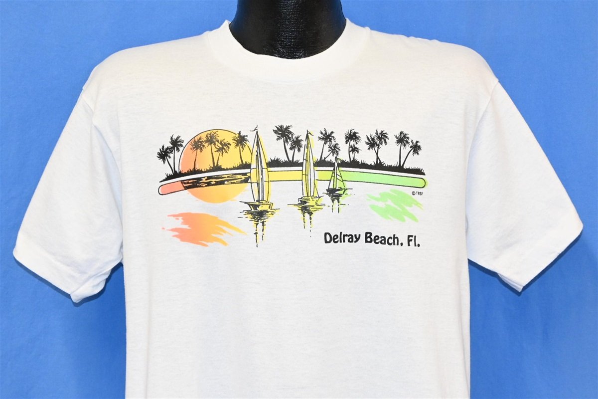 This awesome tee features a neon graphic of a beautiful beach sunset, complete with palm trees and a sailboat on the water. The shirt is a souvenir from the small city of Delray Beach in Southeast Florida. The quaint beach town is a popular tourist destination, and aside from some seaside recreation, the area is also home to nightlife spots and public art galleries like the ones found in the Pineapple Grove Arts District.