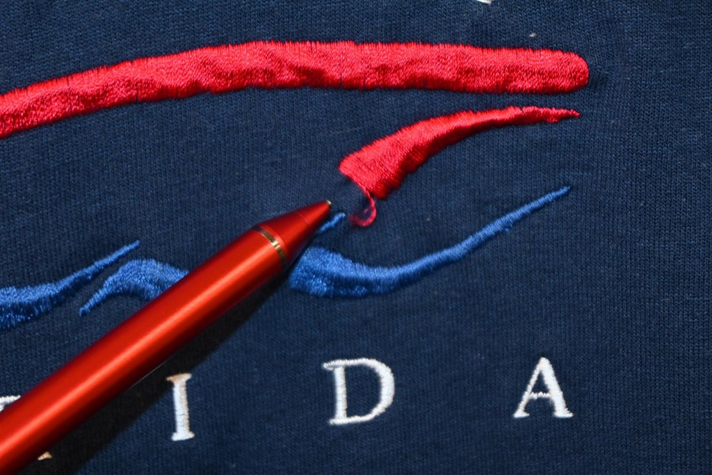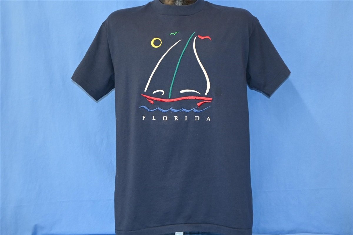 This dark blue t-shirt has a classic 90s design that features an embroidered sailboat. The shirt was designed to be a souvenir celebrating the beautiful southern state of Florida. Florida is a popular tourist destination that's arguably best known for its extensive coastline. Some favorite seaside areas to visit include Miami, Key West, Clearwater, Siesta Key, Fort Lauderdale, and Daytona Beach.