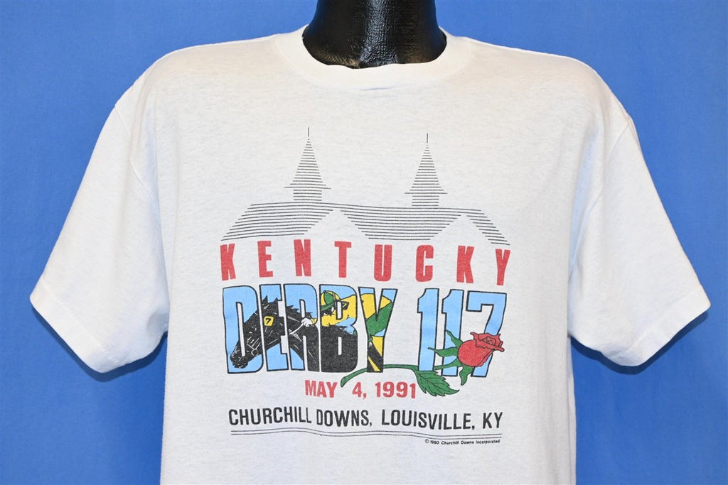 This vintage tee pays tribute to the 1991 Kentucky Derby, which was the 117th running of this famous horse race at Churchill Downs in Louisville. The winning horse that year wound up being Strike the Gold, and over 135,000 people were there to witness he and his jockey, Chris Antley, take first prize. The Kentucky Derby is considered the first leg of the American Triple Crown, and it's often referred to as "The Run for the Roses", in reference to the blanket of roses that's traditionally draped over the winning horse.