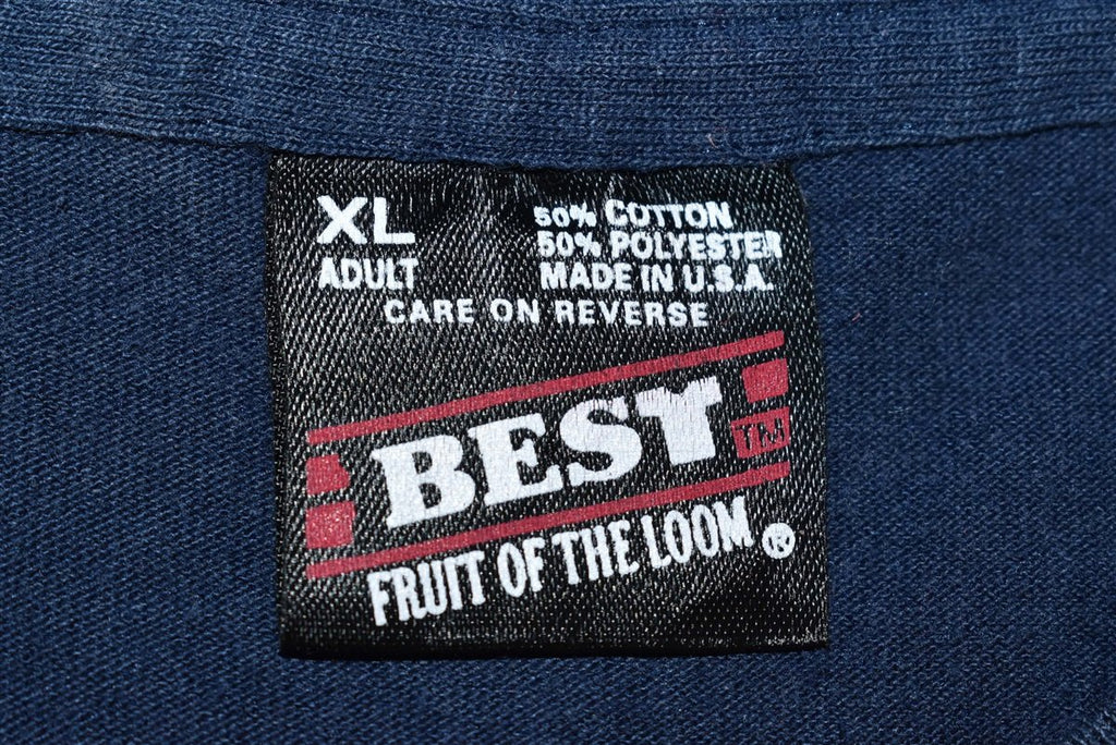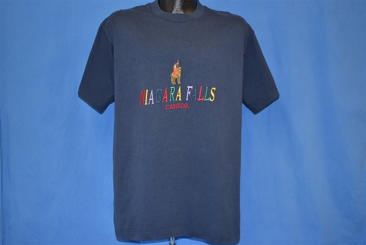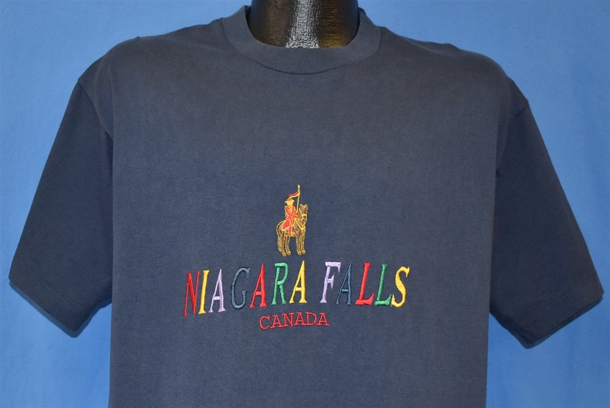 This classic tourist tee pays tribute to Niagara Falls Canada circa 1990s. It's held up great and has tons of life left. Features soft poly cotton, embroidered graphics, and an original Fruit of the Loom tag. The unique rendering of a horse soldier might be a homage to Lord Strathcona's Horse aka the Royal Canadians horse regiment.